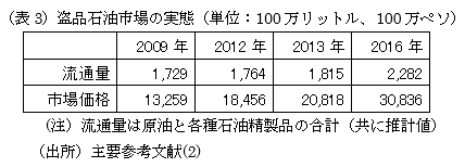 2. 拡大する盗品石油の市場規模石油の窃盗摘発でぺメックスが没収した石油精製品は、年々増加している。この量は2017年には前年比72.5%増加した(表2)。しかし、盗まれた量を遥かに超える石油精製品が、市場に出回っていることが推定されている(表3)。同表の市場価格は原油やガソリン等の石油精製品の合計である。日常の交通手段として重要な自動車で消費されるガソリンとディーゼル油も、被害量の増加が報道されている。 これらの自動車用燃料の一日当たりに盗まれれている量の推計値として、2万7,000バレル(2017年5月14日付ロイター通信)という報道もある。このバレル量は、約429万リットルに相当する(1米国バレル=158.99リットルで換算)。 これらの盗品石油の流通量とその市場価格は、推定値とはいえ、ぺメックスの立場からみればこれも市場を奪われたことによる被害額である。また、盗品の販売という性格から納税は申告する筈はないので、政府の歳入も、失われることになる。 2009年から2016年の盗品石油市場の年間市場価格の合計によれば、次のように増加している。すなわち、2009年-2012年の4年間合計額は、628億ペソ(49億ドル)から、2013年-2016年のそれは972億ペソ(64億ドル)であった。後者の期間は前者に対してペソ金額ベースで約55%増加した(なお、両期間の年間金額は、表3出所のデータより集計)。