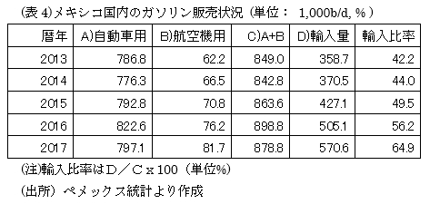 このように盗品石油の流通量は増加傾向が続いているが、その供給元であるぺメックスの生産は停滞している。例えばガソリンの平均日産量は、2013年43万7,300b/dから、2017年25万7,000b/d, 2018年10月17万1,700b/d と低下している。この生産停滞は、ぺメックスの石油精製プラントの老朽化が影響している。ぺメックスは国内生産量の低下による供給量不足を補うために、米国からの輸入を増やしている。 ガソリンの国内販売量に占める輸入品のッシェアは、2016年には過半(56.2%)を超え、2017年には64.9%を占めるに至った(表4)。更に、盗品ガソリンの増加もぺメックスのガソリン市場における支配力を、脅かしている。パイプラインからの抜き取りによる修繕工事期間中の、輸送休止も小売部門のガソリン不足を招いている。パイプラインからの供給不足に対応するために、トラック(タンク車)による輸送増加が輸送コストを引き上げている。 石油燃料1,000トンを1キロメートル運ぶ料金はパイプラインが6ドルで済むのに対して、トラック83ドル、鉄道37ドル、海運12ドルである。