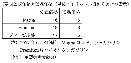 ガソリンの供給体制に関わる問題としては、ガソリンスタンドの在庫保有量が少ないことが指摘されている。その平均的なそれは販売量の6日分から8日分であるが、OECD(経済開発機構)加盟国平均は25日分である(前記輸送料金と在庫量のデータは参考文献3より引用)。このような小規模在庫量も、トラックによるガソリンスタンドへの配送負担の軽減を阻んでいる。また、燃料窃盗犯からの襲撃リスクを高めている。 燃料(ガソリンやディーゼル油)を満載しているトラックが、武装集団から襲われる事件も発生している。配送に従事している従業員が、トラックから密かに横流しする事例もある。 燃料をトラックのタンクに注入する際に、規定量を超えているケースが横流しの犯行に直結している。このようなトラックは配送先に到着する前に、超過量の燃料を窃盗犯に渡している。ぺメックスは横流し防止のために、燃料配送のトラックに注入する量の厳格な管理体制を強化していると発表した。警察や軍隊もトラック輸送途中の監視を、強化している。 パイプラインやトラックから奪われた燃料を販売して、閉鎖処分を受けたガソリンスタンドの事例もある。 石油輸送のインフラで、問題としては貯蔵施設が不足していることが、指摘されている。 特にパイプラインや港に直結した石油貯蔵施設が不足している。そのために、鉄道やトラックによる石油流通拠点への輸送も、不可欠である。鉄道はメキシコ全土を十分カバーするほどには、発達していない。従って、陸上輸送ではパイプラインとトラック(タンクローリー)の連携が、流通の要を形成している。 米国からメキシコに輸出されるガソリンも、パイプラインからの抜き取り被害の増加を反映して、鉄道輸送の利用が拡大する傾向がでている。鉄道はトラックよりも、大量輸送に向いている。また、メキシコ国内の道路状況がトラック輸送の拡大を阻んでいる。 3.安値で販売される盗品ガソリン前記で指摘したように、正規のガソリン市場を脅かしているガソリンやディーゼル油の盗品価格は、公式価格よりも安い価格で販売されている。その実態の一例が(表5)の比較表である。盗品価格は全国的な規模で、明らかにされないのであくまでも、事実の一端として見ることが必要であろう。同表のMagnaはレギュラーガソリン、Premiumはハイオクタン・ガソリンである。これらのガソリンとディーゼル油の盗品価格の盗品価格は、公式価格の半値以下の安さである。 考えられる安値が可能な理由としては、盗品販売者は生産コストや、税金を負担していないことがあげられる。 次に石油窃盗犯罪について、世論の傾向を占めす材料として世論調査の結果を紹介する。 これはメキシコ議会(下院)の関係組織であるCentro de Estudios Sociales y de Opinión Público(略称CESOP)が発表した世論調査報告(2017年6月付の電話による世論調査報告書“Robo de combustible”)より引用した。同世論調査で、石油燃料の窃盗についての設問で窃盗に対する取り締まりが手ぬるいことや、窃盗には関係機関内部に協力者が存在することには厳しい見方が表明されている。窃盗行為を許さない意見が多数を占めている反面、これとは相反する意見が多数をしめる設問項目がある。 先ず、「安価な盗品石油燃料が売られているなら、購入するか」という設問に対して、「購入する」という回答が、83.1%を占めた。一方、「購入しない」が10.4%, 「わからない・無回答」が6.4%を占めた。支出を切り詰めざるを得ない生活実感では、不法な盗品とはいえ、値段が安いという魅力は捨て難いということか。 さらに、「盗品を取り扱ったガソリンスタンドの営業許可を取り消すべきか」という設問では「反対」が76.0%に上った。「賛成」を表明した回答比率は20.3%、「わからない・無回答」が3.7%である。このような回答内容からは、日常の交通手段として自動車への依存度が高い現状から、安価なガソリンが求められていることや、なじみのあるガソリンスタンドが閉鎖されることによる不便さは避けたいという本音も伺える。