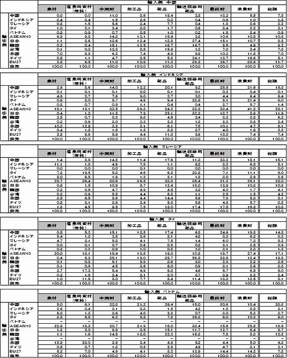 タイも中間財の輸入割合が高いものの、インドネシアやマレーシアほどASEANからの輸入割合が高くはなく50.6%にとどまる。タイはむしろ日本や韓国、台湾からの輸入で中間財の割合が高く、日本で70.9%、韓国79%、台湾76.9%の水準である。ちなみに米国は60.6%であった。