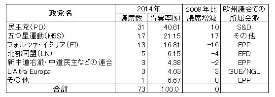 表1の政党グループ欧州人民党には、ドイツのキリスト教民主・社会同盟、フランスの国民運動連盟、イタリアのフォルツァ・イタリアなどが属している。社会民主進歩同盟に属しているのはドイツの社会民主党、フランスの社会党、イタリアの民主党など。英国の保守党は欧州保守改革グループに所属する。政党グループ別にみると保守・中道の既存政党の退潮し、左派・無所属・その他(新規当選者を含む)が伸長している。しかし、国別にみると違いが大きい。欧州議会選挙は争点が見いだせない中、どちらかというと国内現政権の信任投票の様相を呈することになりがちだが、それが今回も現れたといえる。