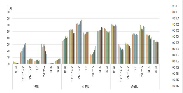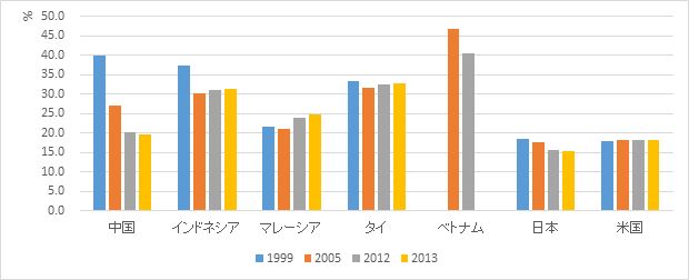 図2:中国・ASEAN及び日米の財別輸出構成比(1999年~2013年、BEC分類)
