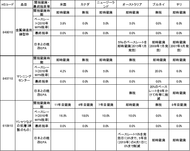 (注)関税率は2015年の税率。関税率の右( )は、FTAを利用できない場合はMFN税率(一般的に適用される関税率)、あるいは利用するFTAを示す。 (資料) 各国関税率表、各国TRS表(Tariff Reduction Schedule)、Global Trade Atlas(GTA)GTIより作成 TPPとEPAのいずれを利用するかTPPを利用した日本の乗用車の輸出においては、半数弱のメンバー国への輸出でTPPは効果的と見込まれる。この理由として、第1に、TPPメンバー国の中で、日本とのEPA(経済連携協定)を結んでいない米国・カナダ・NZでは、TPPを利用すれば乗用車の関税削減の効果を得られることが挙げられる。第2には、TPPメンバーの中で既に日本とEPAを締結している国は8ヵ国あり、一般的にはEPAの発効がTPPよりも先行している分だけ関税削減の効力ではEPAの方が有利なはずであるが、TPPでは関税が即時撤廃されるケースが多いため、TPPの利用がより有効な場合が想定されるためである。 同様な観点から、金属鋳造用鋳型枠、マシニングセンター、Tシャツの輸出において、TPPの関税削減がEPAと比較して有効かどうかをまとめてみた(表参照)。金属鋳造用鋳型枠においては、既にカナダ、ブルネイ、マレーシア、シンガポール、ペルー、ベトナム、日本では関税が無税(0%)になっている。したがって、これらの国の中で日本を除く6ヵ国への輸出では、TPPの利用による関税削減効果を得ることができない。 TPPの発効により、金属鋳造用鋳型枠のベースレート(MFN税率:一般的に適用される関税率)が即時撤廃されるのは、米国、ニュージーランド、オーストラリア、チリ、メキシコ、の5ヵ国である。この中で、米国とニュージーランドは日本とのEPAを締結していないので、TPPの発効が日本とのEPAよりも早ければ、TPPを利用して関税を削減することになる。 残りの、オーストラリア、チリ、メキシコの3カ国においては、日本とのEPAが発効し、既に関税は撤廃済である。したがって、日本のこの3カ国への輸出では、TPPが発効するまではEPAを利用し、そのあとは原産地規則やその手続きなどの面を比較検討し、EPAかTPPかのいずれかを選択すればよい。 TPPメンバー国の中でマシニングセンターの関税が既に無税であるのは、カナダ、オーストラリア、メキシコ、マレーシア、シンガポール、ペルー、ベトナム、日本の8ヵ国である。これらの中で日本を除く7ヵ国への輸出では、TPPを活用しても関税削減効果は得られない。 一方、ベースレートが即時撤廃される国は、米国、ニュージーランド、ブルネイ、チリ、の4ヵ国である。米国とニュージーランドは日本とのEPAを締結していないので、TPPの発効がEPAよりも早ければ、その時はTPPを利用して関税(ベースレート)を0%にすることができる。日本とブルネイ・チリの間ではEPAが発効しており、EPAを利用すれば関税は0%まで削減できるので、TPPが発効するまではEPAを利用することになる。TPP発効後は、TPPとEPAの利便性を比較してどちらかを選択すればよい。 TPPメンバー国の中で、Tシャツなどの肌着(綿製のもの)の関税が無税(0%)であるのは、ブルネイとシンガポールである。ベースレートが即時撤廃される国はオーストラリア、マレーシア、ベトナム、日本の4ヵ国である。関税が段階的に削減される国は、米国、カナダ、ニュージーランド、チリ、メキシコ、ペルーの6ヵ国である。つまり、無税のブルネイとシンガポールを除いたTPPメンバー10カ国の中で、TPP利用による関税削減効果のある国は日本以外の9か国となる。 その9か国の中で、表のように、日本とEPAを結んでいない米国、カナダ、ニュージーランド3カ国へのTシャツなどの肌着の輸出では、TPPの方が日本とのEPAよりも早く発効すれば、TPPを活用することになる。オーストラリアとベトナムへの輸出では、日本とのEPAでは関税は段階的に削減され2019年に0%になる。TPPではこの2ヵ国の関税は即時撤廃されるので、TPPの発効が2019年以前であれば、両国ではTPPの活用を優先した方がより大きなメリットを得られる。 チリ、メキシコ、マレーシア、ペルーの4ヵ国へのTシャツの輸出では、日本とのEPAの関税は撤廃されているので、TPPよりもEPAを利用することになる。これら4ヵ国の中で、チリはTPPではTシャツなどの肌着の関税を段階的に8年目、メキシコとペルーは16年目に0%にすることになっている。すなわち、チリ、メキシコ、ペルーでは、TPPの関税削減スケジュールの方が、既に即時撤廃されている日本とのEPAよりも関税の撤廃までに時間を要することになる。