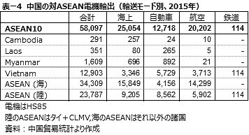 他方、ベトナムのもう一つの輸出品である携帯電話などのIT機器は、基本的には無税品目となっている。FTAがあろうがなかろうが、最適地での生産が可能な商品である。最適地とは部材の調達が容易なすそ野産業が完備している地域のことである。ベトナム、特に北部ベトナムは、中国華南の産業集積地と道路で結ばれ、ベトナムと中国華南の産業集積との間で陸路(自動車)や航空による電機貿易が活発化している(表―4)。