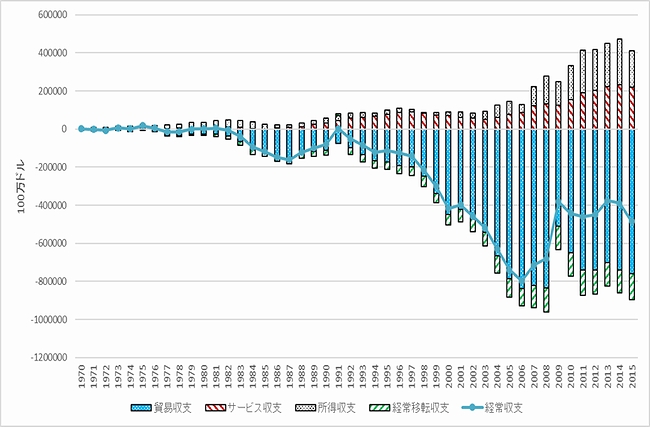 (注) 2015年の米国の経常収支(国際収支ベース)は4,841億ドル、貿易収支は7,693億ドルの赤字。所得収支は1,913億ドル、サービス収支は2,195億ドルの黒字。国別では(通関ベース)、中国から3,657億ドル、ドイツから742億ドル、日本から686億ドル、メキシコから584億ドル、韓国から283億ドル、インドから232億ドルの貿易赤字となっている。 (資料)米国商務省経済分析局(BEA) データより作成