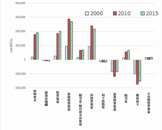 図1の折線で示される米国の経常収支は、貿易収支やサービス収支の他に、海外投資収益などを表す所得収支、さらには援助や労働者送金を含む経常移転収支、を合計したものである(表1の(注)参照)。つまり、経常収支はある意味では国際競争力を表す指標でもある。継続的に経常収支の赤字を続けていると、その分だけ海外に対する債務を増加させ続けることになる。要するに、対外純資産残高が赤字になり、債務国になるということだ。 米国の2015年の経常収支は4,841億ドルの赤字となり、前年よりも赤字が946億ドルも増加した。この2015年の経常赤字の増加は、貿易収支の赤字の拡大とともに、所得収支とサービス収支の黒字の減少で説明することができる。近年においては米国の貿易収支の赤字と経常収支の赤字はほとんど並行して動いている。 2007年以降の米国の経常収支の動きの特徴を挙げるならば、それはサービス収支と所得収支の黒字が拡大傾向にあり、貿易赤字は減らないものの、経常赤字は減少傾向にあることだ。実際に、2013年と2014年には経常赤字は4,000億ドルを下回るほど改善傾向を示した。しかし、2015年には、世界経済の低迷などからこの傾向とは逆の動きが現れた。 所得収支とサービス収支の黒字は2008年のリーマンショックまで拡大傾向にあった。これらの黒字はリーマンショック後の2009年には落ち込んだものの、その後は再び増加傾向を示している。貿易赤字は2009年に急減したものの、それ以降は拡大に転じている。経常収支の赤字は、2006年の約8,000億ドルをピークに、それ以降は2013年には約3,800億ドルまで減少したが、2014年からやや増加傾向にある。 米国の2015年の貿易赤字は7,593億ドルであり、サービス収支の黒字は2,196億ドルであるので、両者を合計した貿易サービス赤字は5,397億ドルになる。トランプ政権のナバロ・ロス経済閣僚の論文では、米国の貿易サービス赤字を5,000億ドル減少させることを目指している。つまり、輸出を2,500億ドル増やし、輸入を2,500億ドル減らし、現時点の貿易サービス赤字を一掃させようとしている。そうなれば、経常赤字はプラスに転換し、いつの日か米国の対外純資産残高はプラスに戻る可能性がある。 しかし、貿易サービス赤字の解消には、前述のように国境調整税を用いて、輸出への法人税を免除し輸入への法人税を引き上げるなどの、荒い外科手術が必要になる。この手術には激しい副作用が伴う可能性があり、トランプ政権の出方が注目される。 (2) 大幅な黒字を示す米国の直接投資収益経常収支の中でも、所得収支は米企業の海外子会社の利益や株・国債への投資などを含む。実際に、図2のように、米国の所得収支は雇用者報酬(在外米国大使館が現地職員に支払う給与や在米外国公館から居住者が受け取る給与など)と投資収益の2つから成る。投資収益は、直接投資収益(直接投資による利益配当金や再投資収益など)と証券投資収益(株や国債への投資などからの収益)、及びその他投資収益(貸付・借入利子収入など)の3つを足し上げたものである。米国では直接投資収益の黒字幅が大きく、証券投資収益は赤字である。ちなみに、日本では証券投資収益の黒字の方が直接投資収益の黒字よりも大きい。