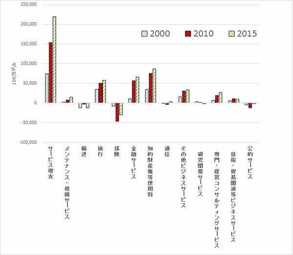 図2からわかるように、2015年の米国の直接投資収益は2,702億ドルの黒字となり、絶対額ではむしろ所得収支の黒字よりも大きかった。証券投資収益は863億ドルの赤字であり、その他投資収益が174億ドルの黒字であった。 2015年と2000年を比較すると、証券投資収益の赤字額は両年ともほぼ同じであるが、2015年の直接投資収益の黒字は2000年の3倍弱の規模に達している。2015年には投資収益の黒字額を2000年から1,758億ドルも増やしているが、これは両年間の直接投資収益における増加分とほぼ同額であった。この結果、2015年における所得収支の2000年からの黒字拡大は、米国の海外子会社の直接投資収益の増加でほぼ説明できる。 また、米国の直接投資収益においては、米国子会社が現地に内部留保している再投資収益の方が、米親企業と子会社間の利益配当金よりも大きい。一方、証券投資収益においては、株式の配当金は黒字であるが、国債などの債権利子は海外への支払い超により大幅な赤字となっている。 したがって、米国における海外からの投資収益の拡大は、直接投資による海外現地法人からの配当金や再投資の増加によるところが大きい。このように、近年の米国の所得収支は主に直接投資収益に支えられて増加を続けているが、それは米国海外子会社の高い収益力が背景にあると考えられる。 (3) 黒字を拡大する米国のサービス収支2000年の米国サービス収支の黒字は743億ドルであったが、2010年にはこれが約2倍、2015年には約3倍になっている(図3参照)。2015年の所得収支の黒字は2000年に対して10倍になっているので、それには及ばないが、サービス収支の黒字も順調に拡大している。 2000年からのサービス収支の黒字増に貢献しているのはメンテナンス・修繕サービスであり、旅行、知的財産権等使用料、金融サービス、専門・技術サービスである。2015年には、知的財産権等使用料は871億ドル、金融サービスは662億ドルもの黒字を上げている。旅行は578億ドル、専門・技術サービスは260億ドル、メンテナンス・修繕サービスは149億ドルの黒字であった。
