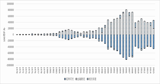 目次 2. 米国では日本よりも40年も前に貿易サービス収支が赤字に転換 3. トランプ新政権は貿易サービス赤字を一掃できるか 4.堅調な米国の企業収益と海外からの資金還流 5.なぜ米国はデフォールトに陥らないのか 終わりに 5. なぜ米国はデフォールトに陥らないのか(1) 対外純資産残高の赤字の持続可能性米国から海外への投資を上回る海外からの米国への投資により、対外支払いの負担が減らない中で、米国の所得収支が黒字を拡大しているのはなぜであろうか。一般的には、外国に対する直接投資、証券投資等への利子・配当支払いの増大により、所得収支は既に大きく赤字転換しているはずである。しかし、現実には直接投資収益は黒字を増加させている。 国際決済銀行(BIS)の2006年版76回年次報告書で米国の対外純資産残高の赤字の持続可能性について分析している。対外純債務残高のGDP比が増加しても、所得収支が黒字である理由として、米国の対外資産の多くはハイリスク、ハイリターンの直接投資から構成されており、外国の対米資産は国債などのローリスク、ローリターンのケースが多いことを指摘している。 換言すれば、米国の海外での資産運用は収益率の高い直接投資や株式投資を中心に行っているが、海外からの資金調達は比較的調達コストの低い債券が主体になる。こうした米国特有の資産の運用方法により、海外からの米国への資金流入額の方が海外への流出額よりも多い純債務国にもかかわらず、海外での投資収益である所得収支の黒字を実現できるのである。 米国の海外直接投資がハイリターンであるのは、国内よりもハイリスクであり、金融を含む知的資産やブランド力があるからである。一方、外国の対米投資に関しては、米国は流動性や保険を提供していることもあり、ローリターンとなっているとしている。 また、米国の海外投資は第2次大戦後から欧州などへ進出しているが、これに対して外国は80年代以降に急速な対米進出を行っており、この進出時期のズレによる成熟度の違いを収益格差が生じる要因に挙げている。しかし、近年はこの収益率の差は縮まっているとし、米国の優位性は低下していると指摘している。さらに、外国企業の対米収益が小さいのは、米国の税が高いため、在米国子会社の利益を圧縮しているためとも分析している。 同報告書では、所得収支が安定的に黒字となり、対外資産からの収益の受取が対外支払いを超過し続ける可能性についても分析している。いくつかのシナリオの内、米国の海外子会社収益率と外国企業の対米資産からの収益率格差が縮小していることを前提としたシナリオでは、所得収支が大きく悪化する可能性があることを指摘している。 (2) 米国への資金還流の推移経常収支は貿易サービスと所得収支、及び経常移転収支の合計であり、赤字になれば物やサービスなどの取引で海外への支払額が海外からの受取額を上回ることになる。つまり、海外から資本を借り入れなければ、国内の資本が足りなくなる。経常収支の赤字が継続すれば、海外からの資本の借入残高とその利子が増加し、いわゆる米国の債務が拡大する。 一国の国際収支表は、経常収支に資本移転等収支(道路・橋などの政府が外国に行う援助など)と金融収支(海外への直接投資、証券投資、金融派生商品、外貨準備など)、及び誤差脱漏から構成される。すなわち、国際収支=経常収支+資本移転等収支-金融収支+誤差脱漏=0、という関係にある。 この式からは、金融収支=経常収支+資本移転等収支+誤差脱漏となり、資本移転等収支を無視すると、金融収支=経常収支+誤差脱漏、になる。つまり、この式から導き出されることは、アメリカは長らく経常収支の赤字が続いており、反対に海外からの投資の受け入れを表す金融収支の黒字によってバランスされる構造になっていることだ。 図8は米国の経常収支が金融収支によってバランスされていることを示したものである。この表の中で、2000年から2015年までの15年間に、米国の経常収支は累計で8.3兆ドルの赤字であったが、それを金融収支の累計7.8兆ドルの入超で埋め合わせている。金融収支の内訳を見ると、直接投資による収支は1.1兆ドルの出超であるが(米国から海外への直接投資>海外から米国への直接投資)、証券投資は逆に6.5兆ドルの入超であった(米国から海外への株・国債の投資<海外から米国への株・国債の投資)。金融派生商品(先物・先渡取引の売買差損益、通貨スワップの元本交換差額、スワップ取引の金利・配当金・キャピタルゲイン等)は2.3兆ドルの入超であった。 つまり、米国は経常収支の赤字を、主に海外の米国の株・国債購入による流入でもって埋め合わせ、資本不足を解消していることになる。この資金還流がうまくいっていることは、図8の動きを見れば一目瞭然である。