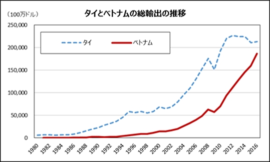ベトナムとタイのASEAN域外輸出を比較すると、これまで10年以上の遅れがあった。ベトナムの域外輸出額は、2000年で118億ドル、この水準はタイの1988年の輸出額(139億ドル)、2010年ではベトナムの輸出額は598億ドル、これは1998年の頃のタイの輸出規模(556億ドル)に対応する。ベトナムのASEAN域内輸出規模はタイと比べて12年遅れであったのが、ベトナムのASEAN域外輸出は2010年以降の5年間で12年の格差を解消した。