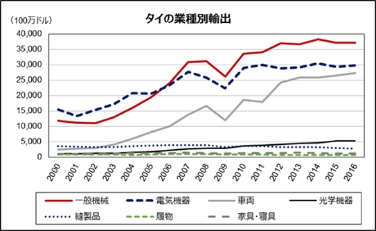 2010年から2000年間におけるタイのASEAN域外輸出の拡大は、食糧品、化学品、一般機械、電機、自動車など幅広く輸出が拡大した。中でも、輸出増加額の約半分を占めたのが機械機器である。機械機器の輸出増加額は、一般機械、電機、自動車の順で大きく、自動車は一般機械輸出を下回っていた。タイのASEAN域外輸出拡大に対する増加寄与率では一般機械が自動車より高かった。
