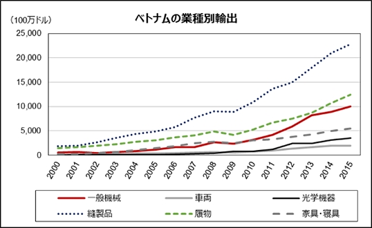 タイが工業製品を幅広く輸出していたのに対して、ベトナムは、アパレルと履物、家具などの消費財の輸出が大きく拡大させていた。