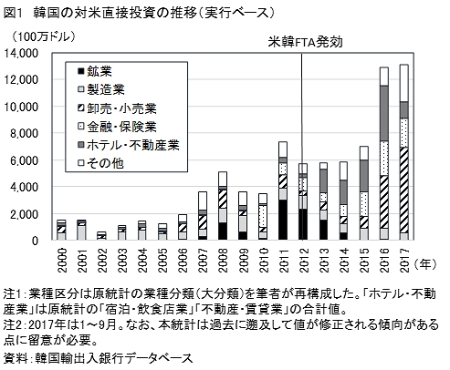 2.最近の主要な対米直接投資事例対外直接投資統計を発表している企画財政部や韓国輸出入銀行では、個別の投資案件について投資企業名を一切公表していない。そこで、韓国の各種メディアや各社発表をベースに、2016~17年の対米直接投資関連の主要事例について、製造業(グリーンフィールド投資、M&A)、非製造業に分けてみることとする(付表)。 製造業のグリーンフィールド投資 - 市場獲得目的が目立つ製造業におけるグリーンフィールド投資では、米国市場の獲得を狙った事例が幅広い分野でみられた。このうち、大型投資の事例としては、ハンコックタイヤのテネシー州でのタイヤ工場建設、クムホタイヤのジョージア州のタイヤ工場建設、サムスン電子のテキサス州オースチンの半導体工場の生産能力増強などが挙げられる。例えば、ハンコックタイヤは8億ドルを投じてテネシー州にタイヤ工場を建設、2017年10月に竣工式を行った。生産能力は当初、年産550万本で、2020年までに1,100万本に拡大する予定である。同社は「2020年にグローバルトップ5入り」を目標として掲げている。それまで韓国、中国、インドネシア、ハンガリーに工場を持っていたが、米国には工場がなかった。世界の自動車メーカーの生産拠点が集積する米国南部地域に工場を建設し、日系を含めた自動車メーカー各社へ拡販し、目標達成を目指す考えである。 なお、トランプ政権の米国製造業振興要請に呼応した対米投資案件に関しては、LG電子が2017年2月に発表したテネシー州の洗濯機工場建設(2億5,000万ドル)が初の大型案件であった。ついで、前述のとおり2017年6月にサムスン電子がサウスカロナイナ州に洗濯機などの家電工場を建設することを発表した(3億8,000万ドル)。両社とも米国のセーフガードの動きに対応し、完工時期を当初の予定より早めたが、このうち、サムスン電子は一足早く2018年1月に工場を完工した。韓国経済新聞(2018年1月15日、電子版)は「サムスン電子は2020年までに生産能力を年間100万台に拡大する計画と発表した。これはサムスン電子が北米市場に輸出する洗濯機の60~70%水準」と紹介している。 ただし、前述のように、現在までのところは、このような動きが幅広く拡大しているようではない模様である。 3.製造業のM&A - 技術獲得目的などを狙う製造業におけるM&Aとしては、まず、米国企業が保有する技術を獲得する狙いのものが目に付いた。その象徴が2016年11月にサムスン電子が発表したハーマンインターナショナル買収で、投資額(80億ドル強)は韓国企業の海外企業M&A案件として過去最高額であった。同社は、将来のコア事業の競争力強化のために新技術を有する海外企業の買収を矢継ぎ早に進めてきたが、その中心が米国企業の買収であった。過去、IoT(インターネット・オブ・シングス)プラットフォーム開発 のスマートシングス買収(2014年8月)、モバイル決裁のループペイ買収(2015年2月)などがあったが、その流れが続いたわけである。ただし、サムスン・グループの事実上のトップである李在鎔サムスン電子副会長が2017年2月に逮捕されて以降、大型M&Aはストップしている。 投資規模は小さいものの、バイオ分野でも技術力獲得を狙った米国企業への出資が散見された。例えば、製薬メーカーの柳韓洋行は2016年4月、米国の合弁会社のパートナーでもある抗体医薬品開発のソレントに1,000万ドルの出資を行っている。 米国市場における流通網確保のために米国企業を買収した事例も散見された。例えば、サムスン電子は2016年8月、家電メーカーのデイコーの買収契約締結を発表した。これは、米国における新築住宅ビルトイン家電事業の強化を狙ったものである。同社は「(デイコーは)北米の住宅・不動産関連市場で高級家電ブランドとしての名声と競争力が認められている」「ラクジュアリー・パッケージのラインアップの拡大と専門流通網の確保などで事業基盤を強化する計画」(2016年8月11日)と発表している。 4.非製造業 - 投資収益獲得目的が目立つ非製造業でもさまざまな分野・目的の直接投資事例がみられるが、まず目につくのは、未来アセット資産運用や現代インベストメント運用といった資産運用会社が投資収益獲得目的で米国の不動産・ホテルなどへ積極的に投資していることである。例えば、未来アセット資産運用は2016年5~6月にハワイのホテル取得やアマゾン本社社屋の一部取得が報じられるなど、米国の不動産・ホテルに積極的に投資している。 ついで、米国の消費市場を狙った進出事例もみられた。例えば、ヘマロー・フードサービスは2018年1月、ハンバーガーチェーン「マムズタッチ」米国1号店をカリフォルニア州に開店した。同社は海外事業拡大に注力しており、米国は台湾、ベトナムに次ぐ3番目の海外進出先になる。ソースを米国風にアレンジするなど、現地化に努め、当初の直営店から、将来はフランチャイズ展開を計画している。 さらに、米国市場での販売ネットワークを確保するためのM&Aもみられ
