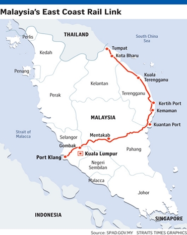 マレーシアにおける「一帯一路」の目玉プロジェクトとされているのが、東海岸鉄道建設です(地図参照)。マラッカ海峡のクラン港からマレー半島を横断してクアンタンへ、さらに東海岸を北上してコタバルまでのルート。南シナ海に面したクアンタンでは、大型タンカーが入れるような深水港を造っています。クラン港から原油をクアンタンまで、マレー半島を横断して運んで、そこから船で中国まで運ぶことができる。あるいは、中国からクアンタンまで物が来て、マレー半島を横断して、クラン港、マラッカ海峡を通って、西に行くという、非常にこれは中国にとっての地政学的なインパクトのあるプロジェクトです。