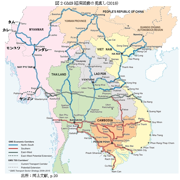 アジア開発銀行(ADB)が構想を主導してきたGMS(大メコン圏)経済回廊は、域内の幹線道路整備が進み、ミャンマーをカバーするルートが増え、呼び名も変更された。2015年までは図1のように9本の経済回廊が特定されていたが、2018年3月のGMSサミットで公表された最新の見直しでは、図2の通り、南北(North-South)、東西(East-West)、南部(Southern)の3系統に再整理されたうえで、それぞれのサブ回廊が増えてネットワークが複雑化している。