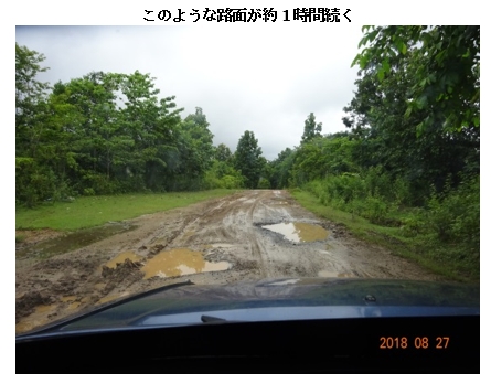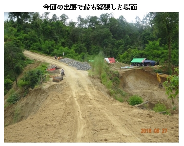 「ダブルトラック道路」を抜けて本線に合流してからも難路だったようですね…モンユワを出発して4時間弱経過したところで「ダブルトラック道路」を抜け、ミンギン村を通過しました。それからしばらくは未舗装のラテライト道路ですが、カーブが少ないので比較的スピードが出ました。 ところが約20分後、険しい山道となり、凹凸が激しい路面に変わります。上り坂から突然下り坂に転じたところから、道路のルートそのものを切り開いて工事中の区間を走りました。両側が切れ込んだ崖となる赤土のぬかるみを通るときは緊張しました。