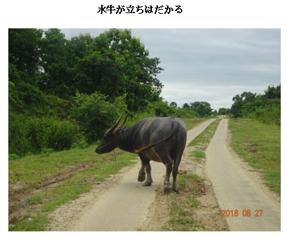モンユワから先のインド国境までの陸路は、インパール作戦の遺影が残る地とも言えます。まず、道路事情はいかがでしたか。現地調達した日産の古い四輪駆動車(運転手つき)で出発しました。モンユワから北西方向への地方道(番号は不明)を5分も走ると路面の痛みが散見され始めます。交通量が少ないので極端に痛むことはないと思いますが、どれほどメンテナンスができているのか疑問です。道路幅が狭いので、低速車両が前にいると視界は狭まり、右ハンドルの日本の中古車の追い越しは厳しいです。さらに10分ほど走ると、交通量は極端に減り、バイクが中心になります。左右は完全な田園風景に変わり、農家がぽつんぽつんと見えるほかは商業施設はほとんど見かけません。牧場を中心とした粗放的な土地利用のようです。電線をまったく見かけず、電化されていないようです。沿道には人間よりも牛や馬の姿のほうが目立ちました。 道路はチンドウィン川を右手に並行しながら、最初の1時間は比較的走りやすい尾根道ですが、その後、カーブの多い険しい山道に変わります。舗装が穴だらけ、もしくは剥がれた箇所が多く、1時間ほど凹凸の激しい路面に苦しみました。