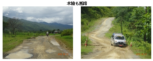 カレーミョへの本線から外れて「ダブルトラック道路」に入ったとのことですが…モンユワから90km強を2時間余り走ったところで、山道を越えて視界が開けてきました。ところが本線から突然右折し、1mほどの幅のコンクリート舗装が2本並行している、これまで見たことのない「ダブルトラック道路」(と命名しておきます)に入りました。二輪車が走るのには問題ないですが、四輪車は舗装を踏み外すと座礁しそうです。幸い我々の運転手は慣れているようで、曲芸のようなハンドルさばきで、この道路を45~50kmを約70分で走り抜けました。のちほど運転手に確認したのですが、本線をそのまま走っていたら、もっとひどい悪路になっていたそうです。この「手抜き」舗装道路は安上がりなバイパスということだと思います。 途中、小川を渡す狭い簡易橋(骨組みは鉄鋼だが路面は木材で組んでいる)を渡ります。水牛たちが何度も行く手を立ちはだかり、警笛を鳴らしてどけさせます。道路の険しさに注意を取られることがなければ風光明媚といえるルートですが、ここをコンテナトレーラーが通るのはとても無理だと思いました。マンダレーからカレーミョへ向かうのに起伏が少ないルートは、北東に進んでシュウェボーを経由する(図2で本ルートの北側に平行する)ルートなのだと思いますが、これものちほど運転手に確認したところ、かなりの悪路のようです。