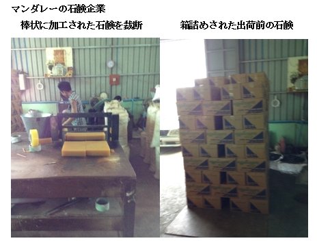 マンダレー、モンユワの工業団地を訪問して、インド市場に輸出しているという地場企業に出会った。1社はマンダレー工業団地で石鹸を製造販売している企業である。もう1社は、モンユワの工業団地で米粉を製造販売している企業である。いずれも中小企業である。 マンダレーの石鹸企業マンダレーの石鹸企業は、1986年の設立で、当初は、マンダレーの地場市場から始まり、ミャンマー全国に拡大させた。マンダレー工業団地内にある工場のキャパシティは1日当たり300箱で、プロセスはより労働集約的である。生産工程は、材料を混合して、加熱し液状にし、次に冷却のために3〜4時間放置する。冷却された半製品は、機械によって棒状に加工され、最終製品として石鹸のサイズに切断される。梱包は手作業で行われているが、梱包機を中国に注文する予定であるという。 原材料の半分以上が国内から供給されているが、その他は中国から供給されている。天津からヤンゴンまでは船で、ヤンゴンからマンダレーへは鉄道を使っている 社長はヤタナポン大学で学んだ工業化学関係の知識を活用して、以前は、非常に伝統的な方法を維持して化学物質を使用していなかったが、より多くの発泡を得るために化学添加物を使用し始めた。品質管理を改善するための小さな実験室も持っている。 課題は、マーケティングと従業員教育である。従業員はほとんどが高校卒業者で、一部は学士を雇っていた。社長によれば、マネージャーは30年の経験を必要とし、上級技術者は少なくとも10年間、一部は30年の経験を要する。オペレーターから始まってジュニアの技術者になるには5年かかる。 最近は、国際ブランドとの競争にも直面している。ユニリバーの石鹸(LUX)は、広告に多額の資金を投じて派手に宣伝をして、高価な石鹸市場に浸透している。しかし、同社の市場は低所得層向けであり、伝統市場で売られている。City Martなどの中間層が買い物に行く近代的なスーパーマーケットでは販売されていない。 もはや、地場の石鹸メーカーも、国際ブランドを無視して商売ができる環境にはないとは思っている。競争相手が少なく、より良い品質の製品としての消費者の認知を得るために、将来的に液体石鹸を開発するつもりである。現在、液体石鹸や洗剤は中国からの輸入品が多く、国内生産は行われていない。 国内の流通経路は、列車とトラックで、主要都市の販売代理店に製品を運ぶ。主に食料品店で販売される。この流通経路を使って、インド市場にも製品が流れている。