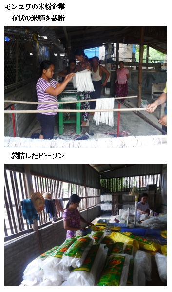 モンユワの米粉企業もう1社は、モンユワ工業団にある米粉企業である。この企業は、もともとは、毛布を生産販売していたが、中国製品との競合で市場を失い、商売替えに踏み切った。モンユワの工業団地内で同様のビジネスをしていた300社ほどがすべて店を閉め、ここの織物産業が崩壊したという。その約4割が縫製工場の切りくずのリサイクル(ベッドに詰める用途など)にシフトしているが、他はどうなったのかわからないという。 米粉生産を始めたきっかけは、このあたりでは過去4世帯しかつくっていなかったので、再チャレンジした。機械設備はできるだけ工業団地内で作っているもの調達した。ただし、コメ洗浄機はベトナム製のものを、粉砕した米粉を2階に噴き上げて米麺の布に加工する機械は中国製のものを輸入した。その布状の米麺を階段状のベルトコンベアで乾かしながら1階に降ろし、細く裁断する機械を通し、最後は敷地内に張り巡らされた物干し竿で乾かす。そして袋詰めする。 商売替えしたときに、30人ほどいた従業員を10人程度に減らし、それと家族・親戚の手伝いで運営している。機械化学習を進め、機械操作を6人がかりで行っていたところ、1人でできるようになった。 販売先は国内が8割でマグウェーやマンダレーの中部ビルマが中心で、残りの2割がタムー国境からインド・マニプール州への輸出である。輸出は、仲卸に委託している。国境までは14時間もかかるという。インド市場向け売り上げの回収は、国境往復を含め2週間後に仲卸から受けとることができる。