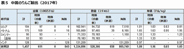 インドの対ミャンマー貿易インドの輸入統計でミャンマーからの輸入品(ミャンマーの対インド輸出品)を見ると、2017年では石鹸やビーフンは見当たらない。石鹸は2010年に僅かな金額が記録されていた。インドの対ミャンマー輸入は、2017年で7.4億ドル、このうち豆類が5.3億ドルと全体の71%を占めている(表1)。次に木材の1.4億ドルである。これで91%を占める。第3番目は、卑金属の2,100万ドル、鉄鋼の1,400万ドルである。ミャンマーの対インド輸出は、豆が主力品で、2017年では、緑豆、き豆(焙煎前のコーヒー豆)の輸出額が大きかった(表2)。 一方、インドの対ミャンマー輸出は、2017年で10億ドル程度、糖類2.2億ドル、医薬品(胃腸薬)1.8億ドル、機械2.4億ドルが主な輸出品である(表3)。 陸路による中国の対インド輸出中国からインドに陸路の輸出額は、65億ドルとなっている。海路が509億ドル、空路が106億ドルと海路と空路に頼っている。陸路の輸出品は、電話機部品(29億ドル)、携帯電話(7億ドル)、ディスプレーモジュール(4億ドル)、リチウムイオン電池(2億ドル)等で電話機部品が半分近くを占めている。これは空路と似ている。 税関区別の陸路輸出額は、黄埔江(29億ドル)、深圳(22億ドル)、広州(8億ドル)、武漢(1.4億ドル)、昆明(1.35億ドル)となっている。上位4か所は中国のIT機器生産地域である。これらの地域からインドに直接トラックで輸送しているケースもあるかもしれないが、香港などのインドとの航空便、船便の利便性が高い地域にトラックで運びそこからインド向けに輸出しているものと推測できる。 陸路を使ってインド市場にアクセスすることが、比較的容易と思われる昆明税関区の対インド輸出額は、2017年で12.7億ドルである。このうち、陸路による輸出は1.35億ドル、空路が11.3億ドルと圧倒的に空路に依存している。輸出品は、電話機部品が8億ドル、携帯電話が1億ドル、デジカメ9,700万ドル、リチウム電池が4,600万ドルと電機が11.5億ドルを占めている。これらは、携帯電話を除いてほぼ空路で輸出している。昆明から陸路で輸出している品目は、携帯電話の1億ドル、PCの1,400万ドル、電話機部品の1,100万ドル、コンピュータの出入力装置、機械部品の5品目である。携帯電話の輸出は2017年から始まっており、ほぼ陸路で輸出されている。それ以前は皆無であった。 他方で、ミャンマー・インド国境のミャンマー側の町タムーの国境市場には、中国製品で溢れている。衣料品や電気・電子製品(見た目は低中級品)、玩具などすべて中国品、加えて中国産のリンゴが大量に売られていた。 中国産リンゴの対インド輸出は、輸送モードでみると、海路による輸出である。中国のリンゴ輸出は、陸路で2017年に6.1億ドル、ベトナムに1.5億ドル、ロシアの9,700万ドルに次いでミャンマーが第3位の9,500万ドル(表5)となっている。昆明税関区からミュンマーに陸路で輸出しているリンゴの数量は7万トン、㎏あたりの単価が1.33ドルである。 タムーの国境市場のリンゴは、ミャンマーに輸出されたリンゴを、ミャンマーの仲買人によってインド人向けに販売しているものであろう。電機用品や衣料品などの中国製品も同様にミャンマーの仲買人が、インド国境まで運んで、インド人を目当てにして販売している小売りに卸しているものと思われる。中国の対ミャンマー輸出には、ミャンマーの仲買人によるインド市場向けの再輸出品が多く含まれているものと推測できよう。