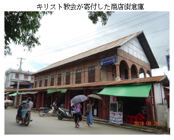 インドとの結びつきも強い。チン族はミャンマーのチン州だけでなく、インドの西隣のミゾラム州や北隣のマニプール州にも多数住んでいるということです(上図参照)。戦後にビルマ族が過半を占める国家としてミャンマーが英国から独立する際に、広範囲にわたって住むチン族を分断する形で国境が引かれ、国境近辺の住民は、インド人となるか、新生ビルマ人となるか、選択を迫られたというような事情だと推測します。ミャンマー側では、ミゾラム州に残ったチン族を「ミゾーチン」と呼び、ミャンマー国籍をもつチン族とは区別しているようです。 チン族の多くは仏教徒ではなくキリスト教徒です。カレーミョ市街にはキリスト教の多様な宗派の教会があります。市街西側にはPresbyterian(長老派)の教会が5つほどあり、東側にはメソジストの教会が2件、南側にはカトリック教会も見ました。市街中心部のマーケット周辺にはメソジスト教会が建設した病院や商店街倉庫などがあります。隣のチン州は人口47万人のうち、9割がキリスト教徒だという情報もあります。