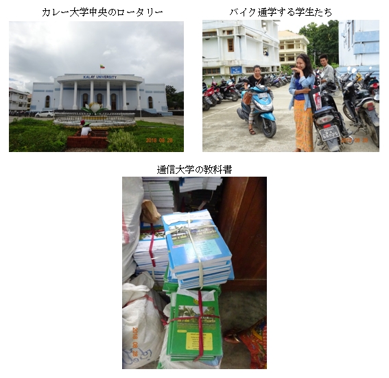上述のガイド氏もホテルの若い女性スタッフたちも英語が流暢なチン族でした。ミャンマーの辺境州に住む少数民族にとって、キリスト教会が現地住民の教育や福祉に貢献するとともに、英語習得の機会を与え、ひいては彼らに経済機会をもたらすという連鎖があるのだと思います。多数派のビルマ族にとって、僧院学校(日本の寺子屋に相当)が低所得層に社会福祉・教育の機会を与えてきたのと類似の構造でしょうか。 ガイド氏は、カレー大学の通信大学の英語科を昨年に卒業したとのことですが。カレーミョとその近郊にはカレー大学、カレー工科大学、コンピュータ大学(University of Computer Studies)の3大学があります。 カレー大学は、2003年にカレッジから総合大学に格上げし、チン州とザガイン管区を管轄区に住む学生を対象としています。 面積は285エーカー(約113ha)と広く、医学、工学、情報科学以外の人文、社会、自然科学の12学部を擁し、学生数は約1万5,000人、うち半数は通信制学部(distance education)の学生です。 大学構内はバイクだらけでした。学生寮の収容人数が限られているうえ、広いキャンパス内を歩いて移動するのは大変なので、学生たちはほぼ全員バイクで通学しているようです。収入のない学生がバイクを購入するのは困難でしょうから、裕福な家計でないとこの大学にフルタイムで子供を通わせることはできないのではないかと思いました。 フルタイム学生の学期は12~3月と6月~9月の2学期制で、通信制の学生は、フルタイム学生の休暇期である4~5月と10~11月にだけキャンパスにやって来る仕組みになっています。学生の民族構成は不明ですが、大学の管轄範囲からすると、チン族が過半だろうと思います。 通信大学は1970年代に遠隔地での教員養成のためにヤンゴン教育大学に本部が置かれた通信大学がはじめでした。1992年に教育省が法律、経済など文系に限って正規の大学として全国各地にキャンパスを設置した。カレー大学の通信大学は、マンダレー大学のサブプログラムで、医学・工学を除く15専攻があります。登録学生は学年ごとに当概年のテキストを渡され、毎学期、3か月自習ののち、1か月間キャンパスで集中的に講義を受け、その後、試験を受けるということです。終了率は8割ほどだそうです。 通信制の大学では働きながら学ぶことが可能ですから、家計に余裕がない人たちはこちらを選ぶでしょう。授業料は2学期制の1学期あたり4~5万チャット(約3,000~4,000円)ということですから手が届く範囲でしょう。