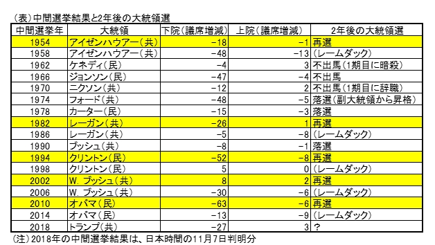 それにもかかわらずオバマ、クリントン、レーガン、アイゼンハウアーは中間選挙の2年後の大統領選挙で、いずれも再選されている。2期目を目指して落選したのは、フォード、カーター、(父)ブッシュの3人である。今回の中間選挙での民主党の躍進を「blue wave」とする報道があるが、下院で共和党は議席を27(日本時間11月7日時点)減らしたものの、上院では3議席増えている。中間選挙で所属政党の上院議席数を3議席増やしたのはケネディ以来となる。「blue wave」は「red wall」にやや阻まれたとみるほうがよく、今回の中間選挙結果の2年後の大統領選挙への影響は大きくないといえよう(注)。 <税制改革2.0法案、医療保険制度の見直しは暗礁に>しかし、上下両院が「ねじれ議会」となることで、トランプ政権の政策運営が難しくなることは否定できない。アメリカでは法案提出権は上下両院議員のみであるが、付託された法案をどう審議するかは、常設の委員会の委員長およびその傘下の小委員会の委員長が決める。今回下院の多数派が民主党に変わることで、これら委員長ポストはすべて民主党に変わる。従って今後はトランプ色が強い予算や法案が下院を通りにくくなる。 焦点となる1点目は税制改革2.0法案である。トランプ大統領は、2017年末成立した税制改革法(TCJA:Tax Cuts and Jobs Act)をさらに進め、中間所得層(個人と一部事業主)の10%減税などを内容とするTCJA2.0の成立を目指している。中間選挙前には、ホワイトハウスと議会共和党は関連する法案の成立を急ぐとした共同声明を発表していた。民主党は、共和党が進める減税第2弾には反対している。 2点目は、医療保険制度改革法(ACA いわゆるオバマケア)の見直しである。トランプ大統領は2017年就任後最初の大統領行政命令(Executive Order)でオバマケア廃止を掲げたように、オバマケア見直しはトランプ大統領の最優先課題である。しかし廃止法案成立には民主党議員も含む上院の2/3の賛成がないと不可能であったため、これまで実現できていない。他方、今回民主党が下院多数を占めたことで、医療保険制度改革法の適用範囲の拡大などの期待が高まっていくとみられる。しかし、上院は共和党が多数を占めており、現行の医療改革法の見直しは進みそうにもない。 3点目は連邦政府機関閉鎖の回避である。アメリカでは2019年度(2018年10月〜2019年9月)の予算については、国防、労働・健康福祉、教育関連などの通年予算は今年9月に成立しているが、通年予算が成立していない一部政府機関の資金繰りは、12月7日までの暫定予算で賄っている。12月7日まで、第115連邦議会のレームダック会期が16~20日間残っているが、それまでに必要な法案を成立させておかないと、一部連邦政府機関が閉鎖されることになる。トランプ大統領は、かねてより、「民主党は、減税の偉大な成功を弱めるために政府閉鎖を望んでいる」とツイートしている。 <インフラ対策では民主党と連携も>トランプ大統領は、中間選挙の結果を受けて、11月7日に議会民主党との連携を呼び掛けている。また民主党の下院トップであるペロシ院内総務も、今後は共和党と協力して超党派の課題に取り組んでいくと表明した。この超党派で取り組む可能性が高いのはインフラ対策である。民主党はトランプ大統領が当初掲げた1兆ドル(約113兆円)規模と同様の(道路や鉄道を中心とする)インフラ支出拡大法案を民主党議会指導部が提出する可能性が高い。インフラ拡大はトランプ大統領も積極的で、なんらかのかたちで民主党案を受け入れる余地がある。この場合連邦予算上限の引き上げ、連邦債務の拡大につながる可能性がある。民主党はインフラ支出拡大のための財源確保として法人税の25%への引き上げ、富裕層を対象とする所得税の引き上げを企図しているが、この案では共和党は乗ってこない。他方、共和党の一部議員からはインフラ支出拡大の財源として、連邦ガソリン税、連邦ディーゼル税の引き上げが提案されている。財源上の課題は残るが、仮にインフラ支出拡大で与野党の合意ができれば、道路や鉄道の補修・近代化に向けて、素材産業も含め一定の波及効果が期待できる。 <10年債利回りは低下し、イールドカーブはフラット化>中間選挙の結果、経済・財政政策が手詰まりとなると、成長に与える影響は追い風(tailwind)から中立的(neutral)となる。金融市場では10年債利回りが下落し、2年債の利回りとのスプレッドは縮小、イールドカーブはフラット化していくと見られている。これは、米連邦準備制度理事会(FRB)が引き締めを続ける一方で、モデレートな成長と抑制されたインフレが続くと、長期債利回りの上昇を抑えていくためだ。しかし、来年以降もイールドカーブがフラット化し、仮に長短金利が逆転に向かう場合は景気後退のシグナルとなるので要注意だ。 また「ねじれ議会」がドル安を進めるとの見方もある。しかし、金融当局が利上げを休止する可能性は低く、ここまでの流れであるドル高が中間選挙