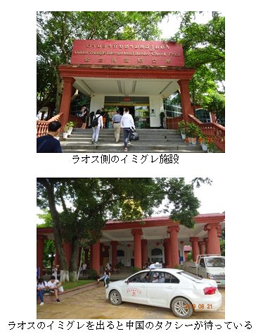 Q.乗船して5分余りで対岸のラオスに着きました。ラオスのイミグレ施設は、やや趣味の悪い金箔ドームで、赤い看板にはラオ語に加えてGolden Triangle International Check Pointという英語と「金三角国際口岸」と中国語が併記されていた。中国に来たような雰囲気でした。-ラオスの入国審査は、5年半前と比べて中国人の数が多く列ができて混んでいましたが、特に問題なく入国できました。こちら側のスタンプには「Sam Liam Kham」、つまりゴールデントライアングルという独自のゲート名があります。 通訳ガイドのFさんにイミグレ係官に聞いてもらったところでは、ここはローカル国境として2006~7年ごろオープンしていたが、2012~13年に国際国境に格上げしたとのことでした。 中国人観光客にとっては、ラオス経由の陸路でファイサイからここに来るパターン、第4メコン国際橋を渡り、タイに入ってからチェンコン経由で来るパターン、チェンマイまで飛んで、チェンライ経由で来るパターンといろいろあるでしょうが、今回いろいろ聞き取りした結果、空路でチェンマイに飛び、そこから陸路で回る観光ルートの一部としてここに立ち寄るというパターンが大半のようです 5年半前は雲南ナンバーの自家用車で陸路で乗り付ける中国人観光客も見かけましたが、今では空路が主流で、ゴールデントライアングルに乗り付ける中国人はタイの観光バスやバンでやって来ているようです。 前回と比べ、イミグレビルとその周辺がアップグレードしていました。免税店、旅行保険会社が入っている。ビルの外の駐車場も充実し、タクシー(上海汽車製の中国車)もたくさん出入りしています。
