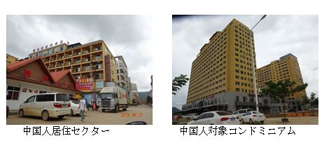 Q、過去2回の視察したときと比べ、特区内の様子にどんな変化がありましたか。-金三角SEZの視察は今回で3回目となります。最初は、7年前にフェイサイから車を借り上げて60km北上しました。2回目は5年半前で、今回と同じようにボートでタイから渡りました。 カジノの北に隣接する低層ホテル,木棉花園酒店Kapok Garden Hotelは、7年前に最初に訪れたときにすでにありましがが、今回はカジノのすぐ裏(東側)に20階建てほどの金ピカ色の、上空から見ると星形をしているような、ド派手なホテルを建設中でした。そのさらに裏には「唐人街」のアーチをもつチャイナタウン(ショッピング街)が建設完了していました。テナント入居はまだこれからというところでした。 カジノを中心に周囲約2km圏内にはすでに中国人住民がしっかり生活圏を築いており、1階が商店や中華料理屋で2階から上が貸し部屋という、中国の都市部で普通に見かけるアパートが林立している様子でした。カジノから天[我鳥]路(Swan Road)というメインストリートを南方向へ3~4km走るあいだには高層のコンドミニアムが続々建設中でした。