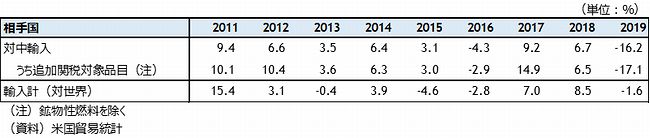 1.2019年の米国の対中輸入は16.2%減、対中追加関税措置が影響2019年の米国の輸入伸び率は前年比1.6%減と微減であったが、対中輸入は前年比16.2%減と大きく落ち込んだ。中国を除いた国地域からの米国の対非中国輸入伸び率は、前年比2.4%増と微増であった。2019年の米国の対中輸入が大きく落ち込んだ要因は、2018年に発動された対中追加関税措置の影響による。対中輸入追加関税対象品目に限定した米国の輸入額(推定)は、2019年で対中輸入が4,256億ドル、前年比17.1%減、前年と比べて883億ドルの輸入減である。他方、対非中国輸入では1兆7,083億ドル、0.8%増と横ばい、前年と比べて248億ドルの増加であった。 対中追加関税品目の対中輸入の減少額に比べて非中国輸入の増加額が少ない。これは、対中追加関税追加関税品目に鉱物性燃料等(HS27)が含まれているためである。鉱物性燃料等(HS27) を除いた非鉱物性燃料(以下では工業品とする)に限定すると、2019年の中国の輸入減少額は878億ドル、非中国の輸入増加額は、448億ドルとなる。対中輸入の減少額の過半が非中国輸入の増加でカバーされた計算になる。