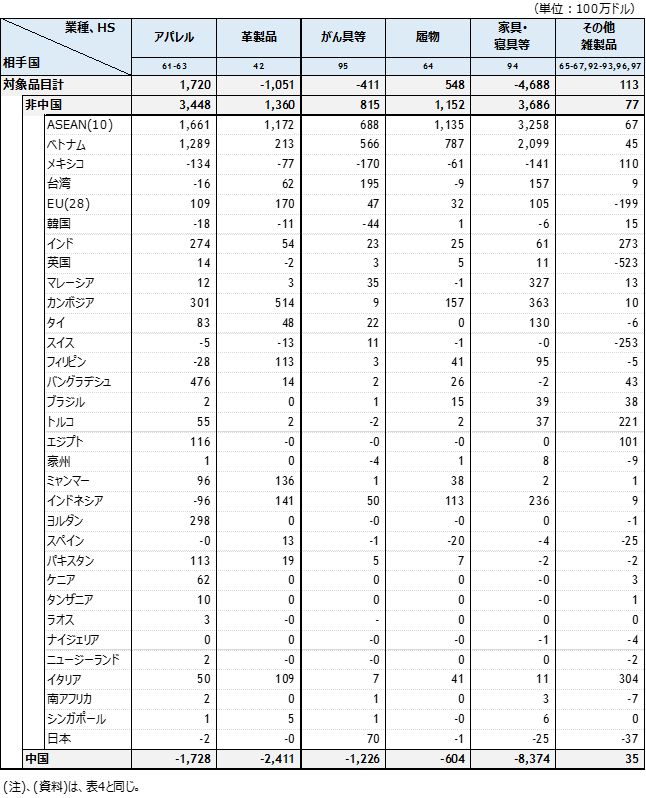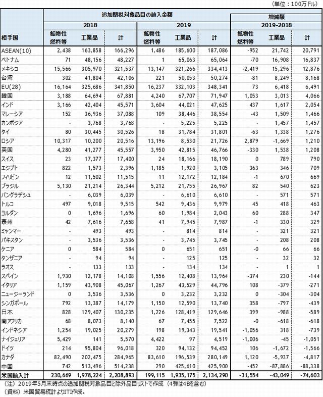 表4 対中追加関税対象品目(非鉱物性燃料)の米国の国地域別輸入増減額(2019-2018年)
