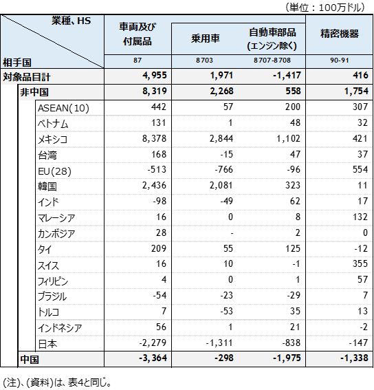 3.追加関税措置で炙り出された中国輸入の代替可能性対中追加関税措置で減少した対中輸入額、878億ドルの業種別内訳は、機械類が552億ドルに対して非機械が326億ドル、それぞれ減少している(表4)。一方、対非中国輸入では、機械類が454億ドルの増加したのに対して非機械が5億ドルの減少となっている。機械類で中国製品の代替が進んだことを窺わせる。 機械類では、ベトナム、メキシコ、台湾、EU、韓国の順で輸入増加額が大きい。機械類以外では、ベトナム、メキシコ、カンボジア、インド、タイの順で輸入増加額が大きい。いずれも、ベトナムとメキシコがチャイナ+1の有力候補である。 追加関税対象品目の輸入増減額を業種別に見たのが表5である。まず、機械類の対中輸入の減少額は、一般機械(HS84)が238億ドル、電機(HS85)が265億ドル、この二つで大半を占めている。一般機械の減少額では、コンピュータ・周辺機器(62億ドル)、コンピュータ部品(110億ドル)が大きい。電機の減少額では、無線通信機器(65億ドル)、携帯電話(44億ドル)、半導体など電子部品(21億ドル)である。 これに対して、機械類の対非中国輸入は、主要業種すべて増加している。ただし、対中輸入の減少額を対非中国輸入の増加額が上回っているのが、車両(自動車等HS87)と精密機器(HS90-91)。下回っているのが一般機械と電機である。 これは、一般機械のコンピュータ部品の対中輸入減少額を対非中国輸入の増加で補填できずに、大幅輸入減少になっていること、また、電気機器の無線通信機器が、対中輸入、非対中輸入ともに減少しているためである。それ以外の業種では対中輸入の減少を対非中国輸入の増加でほぼ相殺されている。 非機械類の業種の対中輸入減少額は326億ドル、内訳は、家具寝具(HS94)が83億ドル、その他原材料別製品(HS25.26、41-49、68-71)が69億ドル、化学品(HS28-40)が61億ドル、鉄鋼23億ドル、卑金属、アパレルが17億ドル、それぞれ減少している。 他方、非機械類の対非中国輸入は、化学品、鉄鋼、卑金属、その他原材料別製品の輸入で減少している。これらの業種は、対中輸入と非対中輸入を合わせて2018年と比べて輸入は減少している。一方、アパレル、玩具、履物、家具寝具等消費財の対非中国輸入は増加している。これら消費財のなかでは、アパレル、履物の対非中国輸入の増加額が対中輸入の減少額を上回って、対中輸入の減少を補填している。 米国の対中追加関税措置の効果の一つは、中国生産に代替可能な業種(製品)が炙り出されたことである。対中輸入と対非中国輸入の増減額を業種別に詳細に見ると、前述したように、対中輸入の減少を対非中国の輸入の増加で部分的にも相殺されている業種は、コンピュータ機器・部品、無線通信機器(携帯電話など)、電子部品、受像機など電機や精密機器等の機械機器、食料品やアパレル、玩具、履物、革製品などの消費財に多い。対中輸入、対非中国輸入ともに輸入が減少している業種は、化学品、鉄鋼、原料別製品などである。 このうち、機械機器や消費財の対非中国輸入の国地域別内訳をみると、業種ごとにすみ分けが起きている。 例えば、対ベトナム輸入は、半導体等、無線通信機器、携帯電話などの機械機器、消費財ではアパレル、玩具、履物、家具・寝具の輸入増加額大きく、ベトナムはこれらの業種において中国に代替する最大の生産拠点である。対メキシコ輸入はコンピュータ処理装置、受像機、自動車・同部部品、機械以外では食料品の輸入増加額が大きく、これら業種でメキシコが対米輸出拠点となっている。 対台湾輸入ではコンピュータ・周辺機器や同部品、無線通信機器が大きく、台湾が米国の輸出拠点となっている。このほかでは、コンピュータ関連ではフィリピン、半導体等電子部品ではマレーシア、タイ、無線通信機器ではインドネシア、フィリピンの輸入額が増加している。アパレルでは、インド、バングラデシュ、カンボジア、ヨルダン、パキスタン。履物ではカンボジア、インドネシア、家具・寝具などではカンボジア、マレーシア、インドネシア、タイがそれぞれ輸入を増加させている。 ここからいえることは、世界の工場、中国生産に代替するには、中国と同じような生産規模が可能な国を発掘するのではなく、ASEANや南西アジアを中心に複数の国が集まって、それぞれ得意分野の生産を分け合うことになる。米国の対中追加関税措置は、その意図とは別に、中国生産を解体し、リスク分散化することで、発展途上国の工業化を推進する契機となるのではないか。