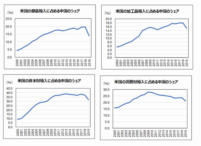 5.今後の展望、WTO加盟以前の水準が目安米国の対中追加関税措置で明らかになった点は、脱中国の動きが予想以上に速かったことであろう。対中追加関税品目の米国の米輸入に占める中国のシェアは、2018年の26.0%から2019年には23.0%に低下している。個別業種では、一般機械が31.5%から25.1%、電機が42.5%から36.4%、このうちPC・周辺機器が、55.7%から49.7%と2007年以来初めて、50%を割った。携帯電話は81.8%から72.1%に低下している。また消費財では、革製品が46.3%から39.2%、家具・寝具が52.2%から42.6%に大きく低下した。一方、化学品は20.6%から17.7%、アパレルは36.4%から34.1%、玩具は80.9%から78.1%、履物が52.9%から49.6%と微減にとどまっている。ただし、アパレルはリーマンショック後をピークに下落傾向にある。 2019年の米国の対中輸入依存度を財別にみると、加工品が15.2%(2018年は17.9%)、部品が13.9%(同19.6%)、資本財が31.7%(同37.2%)、消費財が21.2%(同23.8%)と特に部品や資本財で低下が著しい。 輸出拠点の脱中国の動きは、中国以外に輸出拠点を確保するチャイナ+1と呼ばれていた。チャイナ+1の歴史は古い。2000年初めのSARS騒動から始まり、2005年の反日デモ、リーマンショック直前の労働コストの高騰や元高、さらに在中国外資系企業のみならず中国企業の間でもTPP対応策として顕在化していた。 これらに追い打ちをかけたのがトランプ政権の対中追加関税措置である。それが長期化(固定化)すれば、中国輸出の採算悪化により輸出拠点の脱中国が一層加速することになろう。とりわけ、中国より労働コストの低いベトナムなどのASEANや南西アジアへの工場移転が進み、これらの諸国の工業化が促進することが期待される。 対米輸出拠点としての中国離れが進む場合、中国の対米輸出はどこまで落ち込むのか。一つの目安は、WTO加盟以前(2001年)の状態に戻ることである。2001年当時の米国の財別対中輸入依存度は、加工品では5.9%、部品は5.3%、資本財は10.0%、消費財は16.2%であった。中国生産を代替する輸出拠点が多くある消費財は、WTO以前の水準に低下する可能性がある。資本財の対中依存度が拡大した要因は、コンピュータ、携帯電話(スマートフォン)がけん引力となったことであるが、これらはすでに成熟化した製品である。また、コンピュータ、携帯電話(スマートフォン)は台湾のEMS企業が米企業から生産委託して主に中国で生産している。台湾のEMS企業が中国生産を他の諸国に移管するかどうかが、カギを握っている。加工品や部品に対しては、今回の対中追加関税措置で予防的に輸入を抑制しており、次に期待されている中国の対米輸出製品の芽を潰している。 米国の対中輸入は、リーマンショック後をピークに緩やかに下落していたが、対中追加関税措置はこれに拍車をかけることになろう。米国の対中輸入は、中国のWTO加盟以前の水準に、急速に落ち込むことになるのではないだろうか。