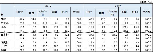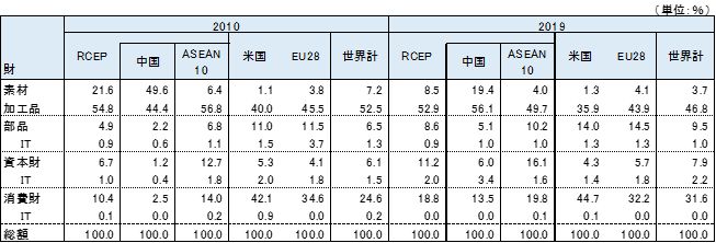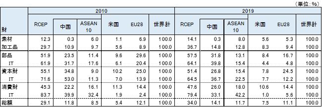 輸入では2019年のインドの対ASEAN輸入財別構成比は、加工品が41.3%、素材が22.2%、資本財が15.4%、部品が13.8%、消費財が7.7%である。加工品ではインドネシア、マレーシアからのパーム油輸入が大きな比率を占めている。素材は原油が大きい。資本財、部品ではIT関連製品の比率が高まっている(表4)。対中国輸入は、加工品、部品、資本財で約9割を占めている。また、IT関連製品の輸入比率が大きく、インドの対中輸入の3割を占めている。インドの対中輸入が拡大した要因は、IT関連製品の急拡大にある。 インドのIT関連製品の輸入に占める中国の比率は、2019年に部品(電子部品など)で39.8%、資本財(携帯電話、PCなど)で36.7%、消費財(映像機器など)33.1%といずれも高い。対ASEANのIT関連製品の輸入比率は、部品が15.4%、資本財が22.5%、消費財が42.2%と消費財で中国を上回っている。