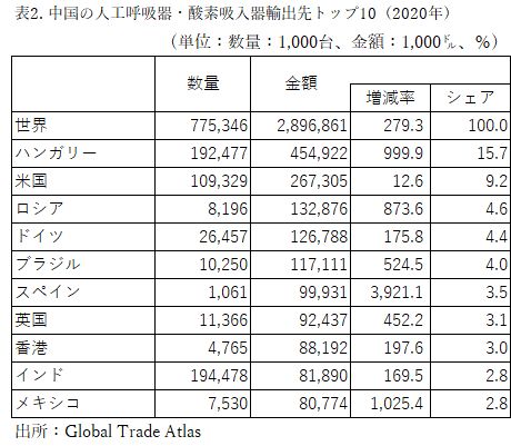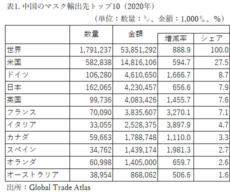 はじめに中国の習近平主席が「一帯一路」イニシアティブを唱えてから7年半が過ぎた。この間、関係国のなかでも中国の援助や投資に対して歓迎する声がある一方で、中国が見せる領土や領海に対する野心に対して、あるいは自国を「債務の罠」に陥らせるのではないかということに対しての警戒感を露わにする国家もでてきた。 一帯一路政策をはじめとして、いまや中国は鄧小平時代の「韜光養晦(注1)」政策を放棄し、世界の覇者たらんとすることを隠さなくなった。しかし、その中国では2020年に年明けから新型コロナ・ウイルス感染症(以下、COVID-19)の感染が急拡大した。折から春節を迎え、多くの人は国内外に旅行をした(注2)ことも相俟って、COVID-19は中国国内だけでなく、世界的に感染を拡大させていった。米国のトランプ大統領(当時)が「China Virus」と呼び、中国への非難を強めるなかで、中国はマスクや人工呼吸器、21年になってからはワクチンも欧米諸国や、一帯一路沿線国を中心とした発展途上国へ輸出し(注3)、巻き返しを図った。 1. マスク・ワクチン外交展開COVID-19で発生源として非難され、劣勢に立たされていた中国は、世界的なマスク不足という状況のなかで、マスクの輸出攻勢にでた。(表1)は2020年のマスク輸出先の、(表2)は人工呼吸器・酸素吸入器の輸出先のトップ10である。マスクの輸出相手国としては、感染者数が最も多い米国を筆頭に、欧州諸国、日本等が並んでいる。輸出額は2019年と比べて、世界全体では9.9倍増加(注4)(金額ベース、以下同)しており、うち米国では6.9倍、輸出相手国として第2位のドイツに至っては17.7倍などと軒並み激増している。輸入国側の統計でみれば、中国のマスク輸出相手国第1位の米国では、マスク輸入額の84.2%が中国からの輸入となっており、2位の輸入相手国のベトナムからの輸入は4.2%にすぎなかった。EUのなかでは最初にアジアインフラ投資銀行への参加を表明し、一帯一路を通じても中国と関係が深く、EUで最初の新型コロナ・ウィルスの感染が伝えられたイタリアのマスク輸入のうち89.7%は中国が占めている。このようにマスクの輸入相手国のなかで中国は圧倒的な存在感をみせている。人工呼吸器・酸素吸入器の中国の輸出額も2020年は19年に比べ世界全体では3.8倍に増加、特に、米国や欧州への輸出を増加させており、これら諸国にとって中国は重要な輸入相手国となっている。