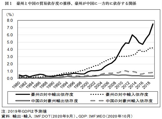 世界経済における影響力拡大を目指す中国に対して、経済の生命線とも言える重要な貿易相手国の間で、反中感情の高まりが鮮明になってきた。その中で、特に注目されている国が豪州である。中国は豪州に対して硬軟両面から影響力を握ろうと仕掛けている。 中国の豪州いじめの発端豪州は、かつては、米国にはまねができないような経済関係を中国との間に築いていた。鉱物資源の対中輸出依存度を高め、対中貿易黒字を計上し、多くの中国人観光や留学生を受け入れていた。 ところが、WSJ紙は、社説に「激化する中国の豪州いじめ」を掲載した(注1)。新型コロナウイルスの発生源に関する独立した調査を主張する豪州政府は、「中国の靴の底に貼り付いたガム」(中国国営メディア)のような存在であるらしい。中国の豪州いじめには伏線があった。2018年8月に、豪州政府が外国による諜報活動や内政干渉を取り締まる法を強化し、米国の政策と歩調を合わせて、中国の通信機器大手、華為技術と中興通訊 (ZTE)を国内の第5世代移動通信システム(5G)から締め出したことから、豪州と中国の緊張が高まり始めた。 次に、2020年春以降、豪州政府が新型コロナウイルスの発生源に関する独立した調査を支持する動きをみせたことで、豪中関係は一段と悪化した。2020年5月に、豪州政府が新型コロナのパンデミックにつながった対応の誤りに関する調査を呼び掛けると、中国政府は反発し、豪州産の牛肉、大麦、ワイン、ロブスターや石炭の輸入を制限し、さらに、豪州国内で中国人に対する人種差別が広がっているとして、国民に豪州旅行を控えるよう呼びかけた(注2)。 対中強硬派と融和派の国内対立豪州国内では、対中強硬派と、対中融和を目指す企業関係者との間で、激しい論争が起きている。世界金融危機に見舞われた2009年には、中国が大型インフラ対策を打ち出したことで、豪州経済は中国の巨大な資源需要のおかげで、景気後退入りを免れることができた。貿易(資源輸出)立国の豪州にとって、中国の機嫌を損ねることは、企業の存立にかかわる問題に直結する。 実際、中国が、オーストラリア産ワインに反ダンピング関税を発動したことで、豪州のワインメーカーの中には、事業のリストラに追い込まれた企業が出てきている。例えば、利益の約3分の1を中国市場で稼いでいたトレジャリー・ワイン社は、不採算ブランドの売却や営業資産の売却、一部のリース契約の解除も検討し、ブドウ園・ワイン醸造・パッケージング業務のコストを削減する対応に迫られた(注3)。 一方、議会の対中強硬派の中核議員グループは、中国への強硬姿勢を維持するとともに、コロナ危機を機に経済の構造改革を進め、対中依存度を減らすべきだと訴えている(注4)。 また、国内の高等教育における中国の影響を巡り、緊張が高まっている。豪州の大学は、収入面で外国人留学生依存度を高めており、その多くは中国からの学生である。大学当局は、中国政府に取り入り、中国人学生を引きつけようとする中で、大学はソフトパワーによる影響力を行使しようとする中国の試みに一段とぜい弱になっているという。 例えば、議論の渦中にあるのは豪大学に設立された13の孔子学院である。孔子学院は中国語や中国文化を教える機関として運営しているが、外国が影響力を及ぼす基盤になっていないか、豪司法長官が主導する調査で厳しい目が向けられている。 貿易を通じた相互依存関係の変化中国の豪州いじめの背景の一つには、貿易を通じた相互依存関係の変化がある。豪州と中国の貿易依存関係は、豪州が対中輸出と輸入に過度に依存している状態である(図1)。世界金融危機後に、それまで豪州の対中輸入依存度が対中輸出依存度を上回っていたのが逆転して、豪州が対中輸出依存度を高めた。豪州の対中輸出依存度を高めたのは鉄鋼石の輸出が拡大したためである。一方、中国から見れば、対豪州貿易依存度は極めて低く、豪州が対中貿易に一方的に依存している。 この非対称的な貿易依存関係が、中国が豪州に対して強気にさせている一因である。しかし、中国も鉄鉱石や石炭、牛肉などの資源食料で対豪輸入依存度が高い(図2,3)。資源輸出国の豪州には、輸出を制限する動機はない。