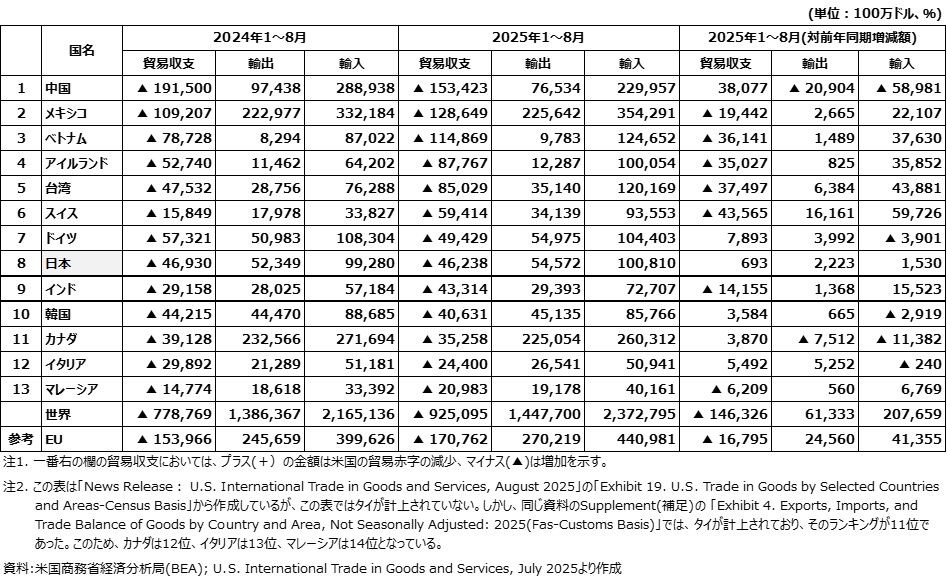 表1. 2025年1~8月の米国の財貿易赤字上位国(センサスベース)