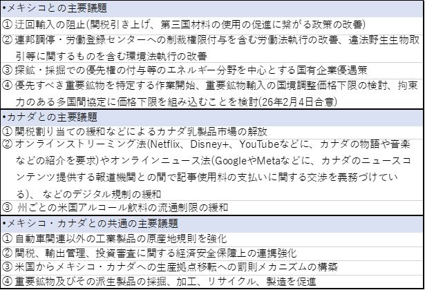 USMCA見直しにおけるメキシコ・カナダとの共通の主要議題としては、①自動車関連以外の製品の原産地規則の強化、②米国からメキシコ・カナダへの生産拠点移転への罰則メカニズムの構築、③重要鉱物の採掘、加工、リサイクル、製造の促進、などが想定される。