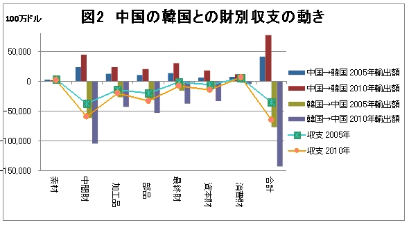 韓国のグローバル・マーケットにおける躍進が目覚しい。アジアはもともと日本優位の市場であった。しかし、近年はLGエレクトロニクス、サムソン電子が廉価で現地専用モデルの投入により、販売のシェアを伸ばしている。LGはインドネシアでデング熱を媒介するネッタイシマカを撃退するエアコンを発売しているが、現地の需要にマッチしたことから売上を大きく伸ばした。 中東地域における韓国のプレゼンスは大きく高まっている。トルコにおける韓国家電製品のイメージは、中国製品よりも高品質で日本製品よりも低価格であるというもの。サムソンは広告宣伝費が潤沢で、日本企業はこの点で水をあけられているようだ。さらに、利益を上げると考えたものを短期間で商品化し、量産してしまうのも強みとなっている。トップダウンによる意思決定の早さと、量産化のスピード、さらにはウオン安、官民一体の売込みが功を奏している。 また、中東では韓国車はアラブ首長国連邦(UAE)やサウジアラビアのような高所得層が多い国では日本車の後塵を拝しているが、中所得国であるトルコでは2009年にはウオン安もあり、現代自動車のシェアは欧米メーカーのルノー、フォード、フィアットなどを抑えて1位となった。エジプトでも、乗用車販売における韓国車のプレゼンスが非常に高い。 中南米では、メキシコの家電産業におけるサムソン、LGのシェアが高まっており、もはや安価な価格でボリュームゾーンを攻めるだけの企業ではない。強いブランド力を武器に値引きをしなくてもハイエンドな高機能商品を販売する力があるようだ。また、韓国企業は、日本企業が商品を投入していない白物家電にも積極的に参入している。 アフリカでは、ナイジェリアでの韓国の家電は、テレビ、エアコン、冷蔵庫、洗濯機の分野で大きなシェアを獲得。LGは、食品大手ネスレと組んだプロモーション活動を行い、輸入販売しているブラウン管テレビ1台当たり蚊帳1張を無料で提供。また、ラゴス大学にデザインラボを設置するなど、宣伝が巧みだ。 このように、韓国の家電はインドなどの南アジア、中東、アフリカ、ロシア・CIS、中南米の市場で日本製品よりも優位に立っている。ASEANや中国や欧米などの市場では、日本製品と拮抗しているが、近年は韓国製品がシェアを伸ばしている。 これに対して、自動車では、韓国車が明確に日本車よりも優位に立っているのは中東の中所得国であり、ASEANとオセアニアは逆に日本の自動車の方が優位である。その他の地域の自動車マーケットでは、韓国車は欧米や中国、ブラジルで見られるように、日本車を激しく追い上げているというのが実情である。 したがって、韓国としては家電での世界市場における成功を、自動車部門でも実現することが次の目標になる。自動車でも韓国の台頭が進めば、日本の国際競争力が剥がれ落ちるような錯覚に陥るが、事実はそう単純ではなさそうである。 一般には、スマイルカーブという考え方によれば、唇のスマイルの形を表すU字型の両端に位置する川上の商品企画・素材・部品及び川下のサービス・メンテナンスの方が、真ん中の下端に位置する製造組み立てや販売よりも利益が高いといわれる。日本は素材、部品などの川上に近い中間財に競争力があり、この分野で利益を上げている企業も多い。 例えば、液晶パネルの中で光の通過と遮断を制御する「偏向板」、軽量化素材である「炭素繊維」、ハイブリッド・電気自動車関連の部品やバッテリー材料、スマートフォンなどの組み立てに用いられる各種部品・加工品、などの分野においては、依然として日本企業が優位を保っている。 日本と韓国との貿易においては、日本の中間財(部品・加工品)が輸出超過であり、図1のように、2010年の日本の対韓中間財貿易は237億ドルの黒字であった。2005年には158億ドルの黒字であったので、5年間で79億ドルの黒字が増加している。日本の2010年全体の対韓黒字は321億ドルであったので、対韓黒字の7割以上が中間財で占められている。 韓国の対日赤字は2000年代から着実に増えている。その大きな原因は、製品に組み込まれる中間財を日本に依存する割合が高まっているためである。つまり、韓国が製品を生産するたびに、日本からその部品や材料などを輸入しなければならない構造が定着している。 したがって、液晶テレビなどの最終製品では韓国が優位にあるものの、組み込まれる高付加価値な材料・部品は日本が供給しているため、家電製品の売上利益が一方的に韓国に流れるわけではない。日本と韓国の家電の製造プロセスにおいては、現時点では補完関係が強化されている。 しかしながら、韓国としては中間財の対日依存の高まりはなんとしても是正したいところである。このため、韓国国内に日本の部品産業などを誘致する動きが活発化している。同時に、日本の技術者を雇用し、技術のキャッチアップに努めている。しかし、その成果は、対日赤字の改