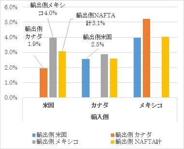 カナダが米国からの輸入でNAFTAを利用した時の関税削減率は2.5%で、メキシコからの輸入では2.9%であった。カナダのNAFTA全体では2.6%なので、米国よりもやや低い関税削減効果が見られる。 メキシコの米国からの輸入でNAFTAを利用した時に関税削減率は4%で、ちょうど米国のメキシコからの輸入の場合と同率であった。この時のメキシコの米国からの輸入でのNAFTA税率(NAFTAを利用した時の関税率で通常はほとんどの品目で0%)は0.3%と他のケースのNAFTA税率よりも高いが、これは農水産品(3.6%)や食料品・アルコール(0.4%)の関税削減率が高いためである。 メキシコのカナダからの輸入での関税削減率は5.2%で高率であった。これは、食料品・アルコール、皮革・毛皮・ハンドバッグ等、輸送用機械・部品の関税削減率がいずれも10%を超えるためである。