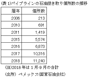 メキシコで企業の犯罪被害が増加している状況については、ITIコラムNo.37(2017年1月18日付、当研究所サイト)で報告した。 本稿で取り上げる石油盗難の実態は、メキシコ最大の石油産業企業であるペメックス(Pemex)の被害状況である。石油盗難はペメックスの収益を悪化させている。また、盗まれた石油精製品(主にガソリン、ディーゼル油、LPG等)が、低価格で販売されることによる流通秩序を乱す被害をもたらしている。 石油を盗む手口は、パイプラインからの抜き取り(英語の報道ではmilkigやsiphoning、スペイン語紙で使うordeñoは、元は搾乳の意味)に加えて、車両(タンクローリー)や鉄道車両、船舶(タンカー)も襲われている。また、ガソリンスタンドからも盗まれている。石油盗難の発生個所は、パイプラインが最多を占める。2017年におけるペメックスの石油(原油と同精製品)輸送量の構成比率はパイプライン77.1%、陸送(タンクローリーや鉄道のタンク車)15.1%、船舶(タンカー)7.8%であった。同年のパイプライン輸送量(1日当たりの量で単位はバレル、以下b/dと表記)は、188.7万b/dであった。 パイプラインから不法に抜き取られる燃料油は、国内供給量(生産量と輸入量の合計)の5%に上ると近年は推計されている。 1.急増傾向の石油抜き取りパイプラインから石油を抜き取る件数は、2017年に急増した。同年に発見された抜き取り個所は1万か所台(10,363)に増加した(表1)。 その被害状況によれば(表2)、犯行に関与した車両台数や検挙人数も例年に見られない急増ぶりであった。また、没収した石油精製品も2,260万リットルで、前年比72.5%増加した。検挙された人数には、ぺメックスの従業員やタンクローリーの運転手も含む。 ぺメックス従業員が犯行に関与する動機には、犯罪組織から強制されていることもある。企業従業員が犯罪組織からの強制を拒めば、本人はもとより家族の命も狙われる恐れがあるために、犯行に関与せざるを得なくなる事例が相次いでいると伝えられている。 例えば、地中に埋設されているパイプラインの場所や、その輸送対象の石油品の詳細、輸送量とその実行日時などは公表されていない。また、車両によるガソリン等の石油精製品の配送スケジュールについても、担当者だけが周知していることである。企業内部の従業員が、犯行に関与する現状はさまざまな業種で広がっている(後記の主要参考文献1参照)。 パイプラインの石油抜き取りは、2018年も前年を上回る増加ぶりで、1月から9月にかけての抜き取り個所数は1万1,240か所に上り、既に前年合計を8.5%上回った。