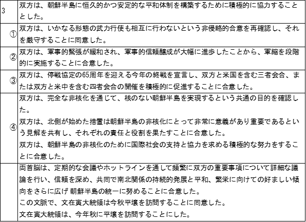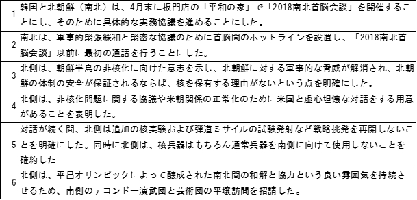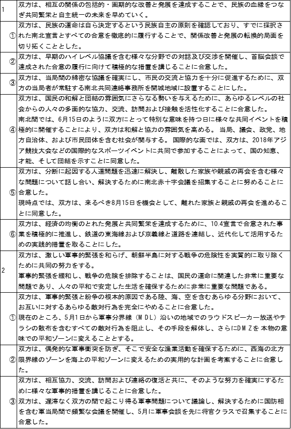 韓国政府にとり最重要なのは、対米向けに北朝鮮が条件付きながら挑発の抑制と核放棄を明言したこと、韓国に対して武力攻撃をしないと明言したことだろう。 これを受けた4月の南北首脳会談で発表された共同宣言(板門店宣言)では、次のとおり、軍事的緊張の緩和と自主統一に重点がおかれている。
