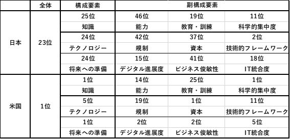 表1:2019年の日米のデジタル競争力ランキング(63か国中何位)