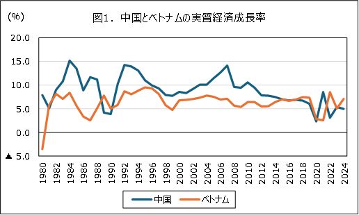 決議68号は、ドイモイ政策以降、民間経済に大きく軸足を踏み込んだ改革宣言である。ベトナム共産党は、1986年に中央集権的な計画経済から「社会主義市場経済」へ転換させるドイモイ政策を断行した。資本主義経済の導入、輸出産業の育成、個人経営・私有財産・私企業を認めるなど、社会主義政策の緩和と市場経済化を推し進めた結果、持続的な経済成長を実現した。しかし、改革開放を推進した中国の経済成長率と比べるとベトナムは見劣りする。ベトナムの経済成長率は、1990年代、2000年代を通じて中国を大きく下回り、ベトナムの経済成長率が中国と並ぶようになったのは、リーマンショック後である(図1)。