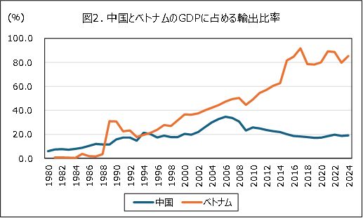 中国の一人当たりGDPは2019年に1万ドルを超えて、2023年は12,510ドルに達したのに対して、ベトナムは4,317ドルと中国の3分の1程度の水準にとどまっている。中国は、中国共産党の第19回大会(2017年)で、2035年に一人当たりGDPを「中位の先進国」の水準にまで高めることを目標として掲げた。