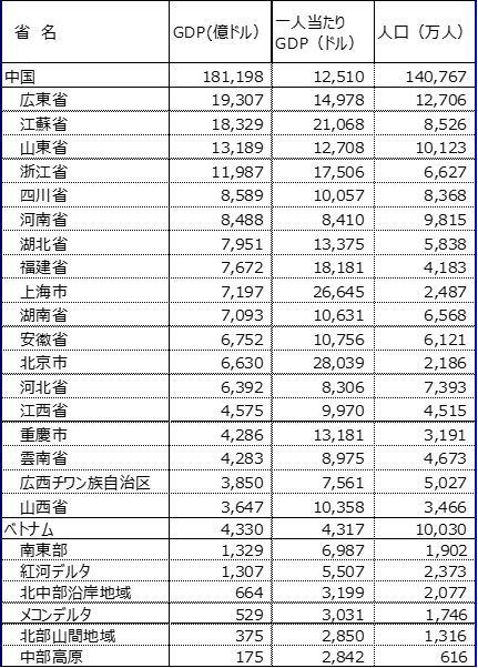 表2. 中国とベトナムのGDP、人口、一人当たりGDP(2023年)