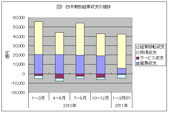 日本の貿易は、80年代から経常収支(注1)の黒字に大きく貢献してきた。この結果、日本のGDPの成長に与える影響力は大きく、80年代、2000年代においては、純輸出(経常黒字)は実質GDPを2%以上も引き上げた。2000年代に入ってからは、海外からの所得(純受取)も実質GDPを2%以上も増加させた。 このように日本経済は、一次産品などの商品市況が高騰しても、純輸出と海外からの所得の拡大に支えられ成長を達成してきた。 しかしながら、グローバル化の進展やリーマンショック、および東日本大震災により、日本の国際収支構造は変化し、貿易黒字は大きく上下している。こうした中で、直近までの経常収支の動きを見ることにより、今後の国際収支構造の方向を考えてみたい。 直接投資収益の増加による所得増が経常黒字を支える リーマンショックから立ち直り、徐々に増加基調にあった日本の貿易黒字は、11年1-3月期には、再び東日本大震災により大きく落ち込んだ。貿易黒字額は5,691億円で、前年同期よりも1.5兆円も減り、およそ4分の1の水準にまで縮小した。 しかし、所得収支(注2)は08年〜10年にかけて減少したものの、11年1-3月期には堅調に推移し、経常収支の黒字圧縮の緩和に貢献した。同時に、サービス収支の赤字幅が、海外からの特許等使用料の収益増により縮小し、前年同期の3分の1の水準になった。 この結果、11年1-3月期の経常収支は所得収支とほぼ同額の3.8兆円で、前年同期よりも1.2兆円の減少となった。すなわち、所得収支増とサービス赤字減により、貿易黒字減の影響が3,000億円ほど縮められたことになる。 所得収支が堅調であったのは、直接投資収益が増加したことや証券投資の配当金収入が堅調であったことが大きい。直接投資収益の増加は、リーマンショック以降、急減した再投資収益(注3)が10年後半から回復に転じたことが原因だ。もしも、再投資収益が回復しなければ、経常黒字はもっと大きく前年同期に対して縮小していたことになる。