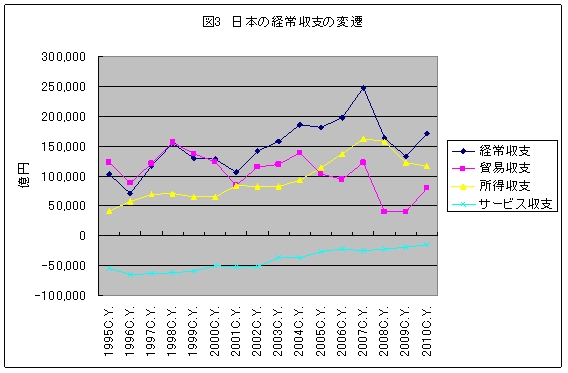 サービス収支の赤字減が経常黒字を底上げ 日本の経常収支は、85年から2000年までは、貿易収支の動きとほぼ並行して推移してきた。しかし、所得収支は01年から増加のテンポを速め、05年には貿易収支を上回り、09年まで経常収支の動きをリードするようになった。 10年の経常収支は、所得収支が減少する中で、貿易黒字の回復の影響を大きく受け、過去2年の黒字減から増加に転じた。しかし、11年に入り、貿易黒字の縮小から、再び所得収支の役割が高まっている。 また、注目されるのがサービス収支の動向である。05年から貿易黒字は低落傾向にあるが、所得収支の増加だけでなく、サービス収支の赤字幅縮小がその減少分を埋め、経常収支の黒字削減圧力を和らげている。 96年を境にサービス収支を構成する輸送収支、旅行収支、その他サービス収支(建設、金融、特許等使用料など)がいずれも赤字幅を縮小し続けている。その他サービス収支の中でも、特許等使用料が03年から黒字転換しており、しかも急速に黒字幅が拡大している。