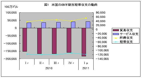 今日の米国が抱える大きな問題はリーマンショックからの脱却である。米国は、これまでに金融緩和策や財政の出動を行ってきたが、引き続き鈍化を示す直近の経済指標や長期にわたる住宅市場の低迷からの回復を図っている。 しかし、財政支出の増加やエネルギー輸入の拡大により、財政赤字と経常赤字の双子の赤字問題は再燃している。80年代からの経常収支(注1)の赤字定着は大きな米国の問題であり、経常赤字に相当する資金が米国へ還流しなければ米国内の資金が不足してしまう。資金が不足すれば、米国内での投資や消費の活動が縮小せざるを得ない。 さらに、経常赤字の累積分だけ対外債務残高が膨れ上がり、外国への利子・配当の支払いにより米国の富が流出し、米国経済に対する不安が増大し、米国への資金還流が滞る事態が想定される。85年のプラザ合意時のようなドル安転換の他に、こうした負の連鎖を防ぐ糸口が見いだせるかどうか、米国の国際収支構造や海外投資構造の変化からその可能性を探ることとする。 2011年第1四半期の所得収支の黒字が大きく増加 まず、最近の米国の国際収支の動向において、どのような変化が生じているのかを見てみたい。米国の、11年第1四半期の経常収支は1,192億ドルの赤字となり、前期よりも赤字が71億ドル増加した(図1参照)。