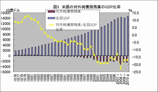 (資料) 米国商務省 経済分析局データより作成 11年第1四半期の貿易赤字は1,825億ドルで、前期から232億ドルの赤字増であった。貿易赤字の増加は輸出を上回る輸入の伸びが原因で、多くはエネルギー価格の上昇を起因とする工業用原材料の輸入増によるものだ。 一方、11年第1四半期のサービス収支(注3)は前期から12億ドルしか増加しなかったが、所得収支(注4)は148億ドルも上昇し548億ドルの黒字に達した。所得収支の黒字増により、経常赤字の増加はそれほど大きなものにはならなかった。すなわち、最近の経常収支の動きの中で、新たな特徴を挙げるならば、それは所得収支の黒字が拡大し続けていることである。 この所得収支の黒字は04年、05年に増加し、06年に減少した後、07年の後半から08年のリーマンショックまで拡大した。リーマンショック後は大きく落ち込んだが、それから四半期ベースでは徐々に増加を続け、11年第1四半期には2000年以降の最高額を記録した。 所得収支の黒字拡大は、構成項目の中でも米企業の海外現地法人からの利子・配当金による直接投資収益の増加でそのほとんどを説明できる。同じく所得収支の構成項目である証券投資収益(注5)の黒字額は、直接投資収益の黒字額よりも一桁小さく、所得収支の黒字拡大には直接投資収益ほど貢献していない。 すなわち、最近の米国における海外からの投資収益の拡大は、直接投資(注6)による海外現地法人からの配当金の増加によるところが大きく、国債や金融市場商品などの証券投資からの利益の占める割合は小さい。 2010年の米経常収支は4,709億ドルの赤字であったが、所得収支は1,652億ドルの黒字であった。しかし、直接投資収益の黒字は2,806億ドルで、所得収支の黒字よりも大きかった。これは、所得収支の他の構成項目である米政府受取支払いが1,346億ドルの赤字を計上したためであった。近年の所得収支は、このように直接投資収益に支えられて増加を続けており、米国系海外子会社の高い収益力がその源泉である。 (注1) 「経常収支」=貿易収支+サービス収支+所得収支+経常移転収支、「経常移転収支」は無償資金援助、国際機関への拠出金、労働者送金等 (注2) 「貿易収支」は、自動車・半導体などのモノの輸出入収支 (注3) 「サービス収支」は、輸送、旅行、金融・保険サービス、特許等使用料、仲介貿易等の受取支払 (注4) 「所得収支」は、居住者・非居住者間の雇用報酬、直接投資収益、証券投資収益、直接・証券投資収益以外の債権・債務に係わる利子受取・支払、ただし、所得収支には直接投資先企業に配分されず内部留保という積み立てられた収益である「再投資収益」が含まれており、必ずしも親会社に送金されているとは限らない (注5) 「証券投資収益」とは、直接投資先以外からの配当金、国債等の債権の利子および金融市場商品に係わる利子の受取・支払 (注6) 「直接投資」とは、親企業が海外投資先企業の株や議決権の10%以上を所有すること 対外純債務残高が増加しても所得収支が黒字の背景 米国の経常赤字は83年頃から顕著に増加し続けているが、既に説明したように、主な理由は貿易赤字の増大にある。米国の貿易赤字は第2次オイルショックが発生した78年から増え始めた。ピークは06年の8,357億ドルの赤字であった。09年にはリーマンショックにより5,059億ドルの赤字まで縮小したが、10年には6,458億ドルの赤字と再び膨れ上がった。過去2年の貿易赤字は、06年〜08年までの8,000億ドル以上の赤字の水準からは低いものの、今後の貿易赤字が急速に減少する事態は想定しにくい。 このため、最近の経常赤字はピークであった06年の8,006億ドルよりは減少傾向にあるものの、このまま加速的に縮小していく可能性は少ないものと思われる。経常収支の赤字傾向が続くとすれば、その埋め合わせのために資金が米国に投資される必要がある。そうならなければ、冒頭に述べたように、米国経済の投資・消費活動の資金が欠乏する。したがって、結果としてこれまで通り外国企業の米国資産の取得は増え続け、米国の外国への利子・配当支払いがさらに拡大することになる。 実際に米国の対外支払いの負担を見るために、米国の対外純債務残高の名目GDP比率を算出した。対外純債務残高は米国の対外総債務残高から外国の対米総資産残高を差し引いた値で、図3のように02年には2兆ドルを超え、08年には3.3兆ドルのピークつけた。対外純債務残高のGDP比率は、2000年代前半には20%近くに達し、08年には22.7%に達した。10年には17%にまで低下しているものの、依然として高い値である。